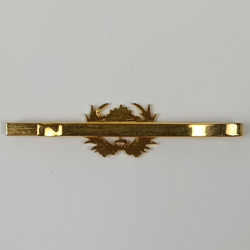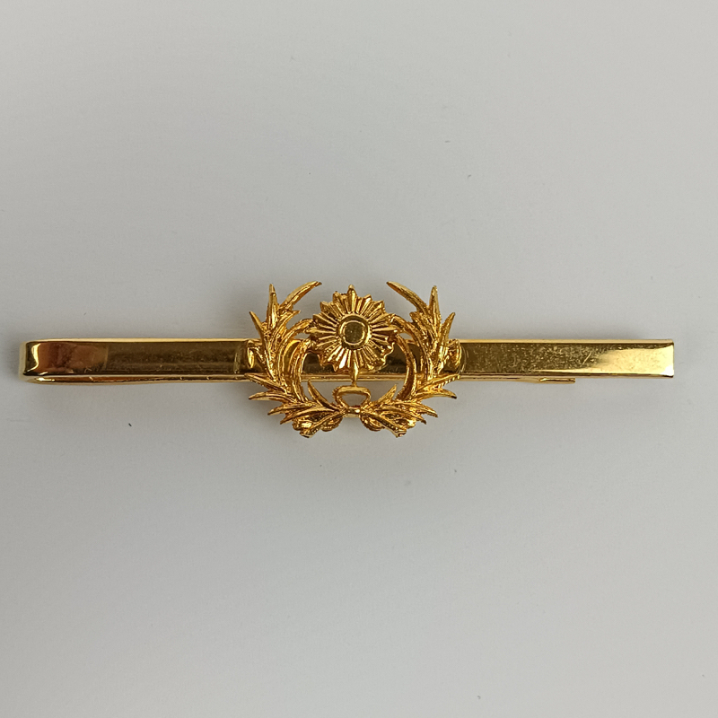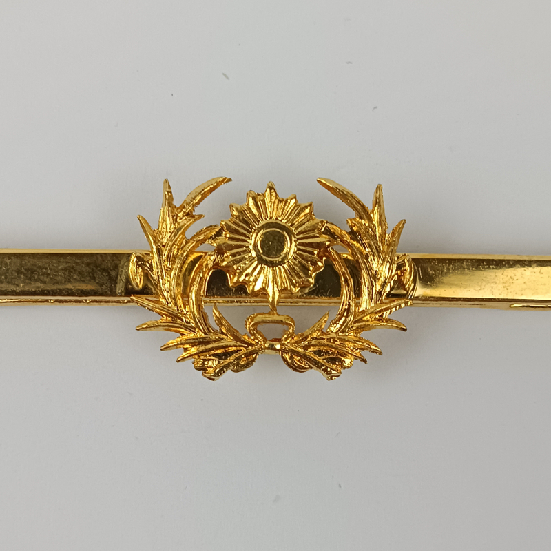 Pisacorbatas metálico dorado con el emblema del Cuerpo de Intendencia del Ejército Español, formado por la rueda radiante rodeada de hojas de roble y palma características de esta especialidad. Fabricado en metal dorado con sistema de pinza en la parte posterior.