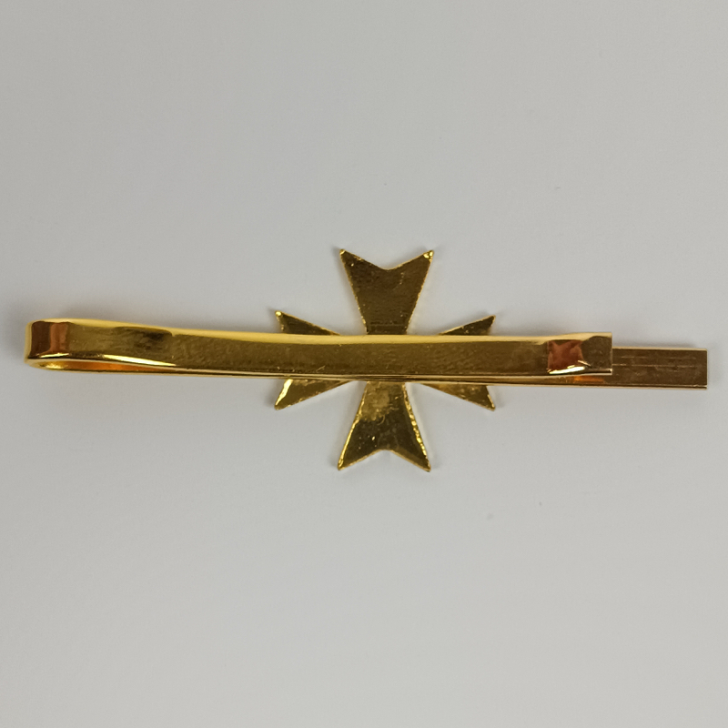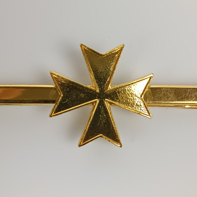 Pisacorbatas metálico dorado con el emblema del Cuerpo de Sanidad Militar representado por la Cruz de Malta en el centro. Fabricado en metal dorado con sistema de pinza en la parte posterior.