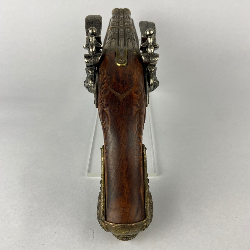 Ejemplar realizado en madera y metal, con abundante decoración en relieve en la platina y empuñadura, siguiendo el estilo ornamental característico de las armas de lujo del Primer Imperio francés. Presenta doble gatillo y doble cañón paralelo, con mecanismo simulado de carga y disparo propio de las reproducciones históricas de colección.