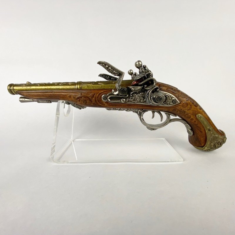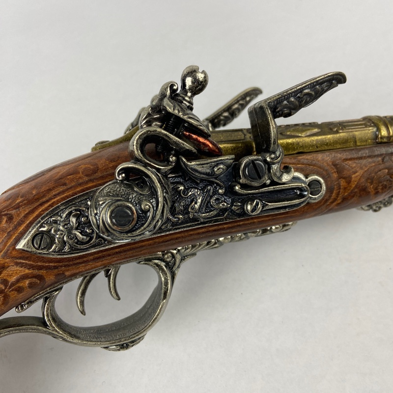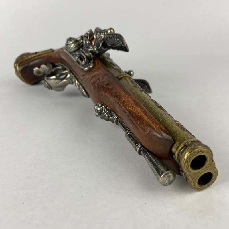 Reproducción decorativa de pistola francesa de chispa de dos cañones, modelo asociado a Napoleón Bonaparte y fabricado originalmente en 1806 por el armero Nicolas-Noël Boutet en Saint-Étienne. Este tipo de pistola doble ofrecía la ventaja de disponer de dos disparos consecutivos sin necesidad de recarga inmediata, algo especialmente útil en combate o defensa personal durante el periodo napoleónico.