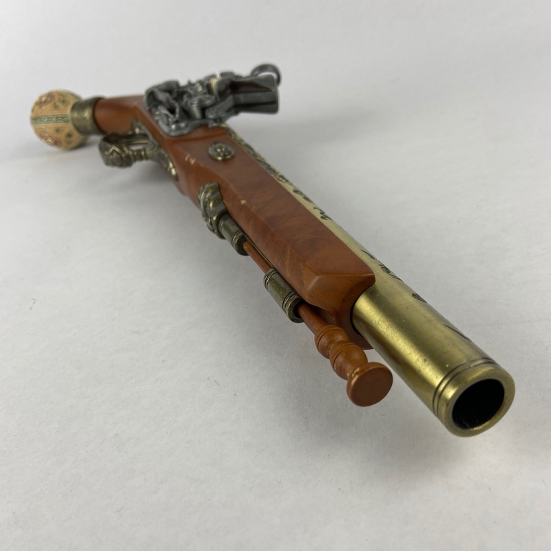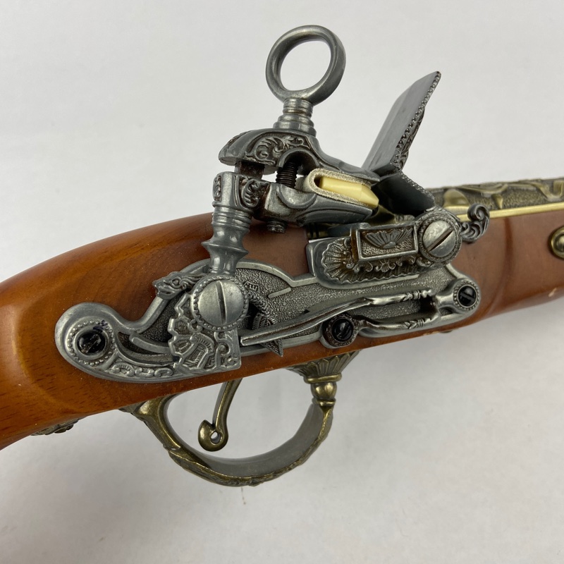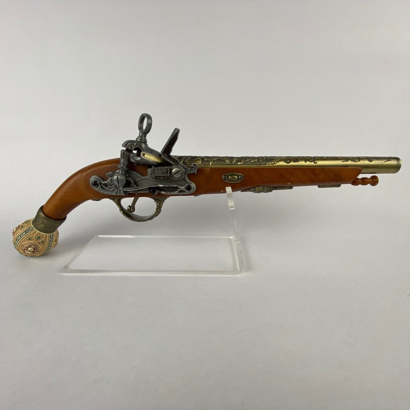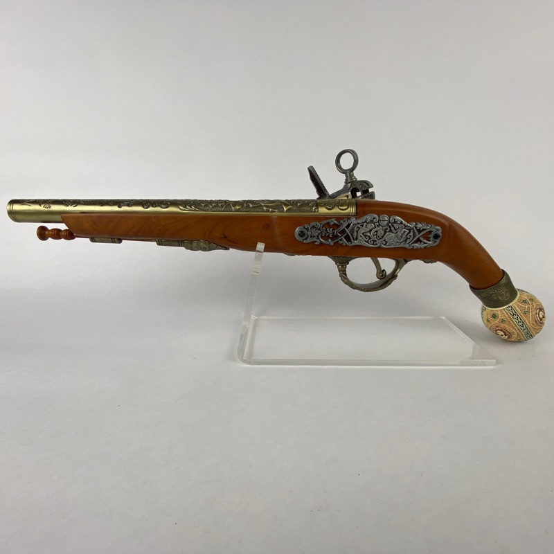 Reproducción decorativa de pistola de chispa europea inspirada en modelos utilizados durante el siglo XVII, periodo en el que este tipo de armas se extendió ampliamente por distintos territorios del continente. Las pistolas con cañón largo y empuñadura rematada en pomo esférico eran habituales en ámbitos civiles y militares, destacando por su cuidada ornamentación.