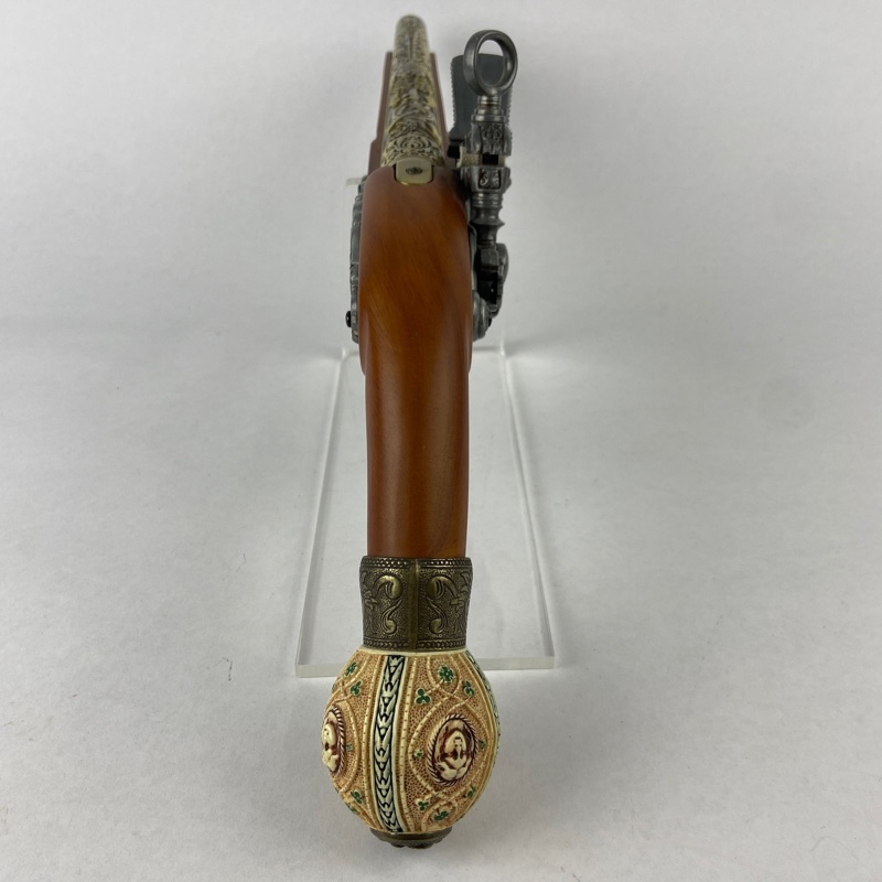 Ejemplar fabricado en metal y madera con cañón largo decorado con grabados ornamentales visibles en la parte superior. Presenta mecanismo de chispa simulado con anilla superior característica, detalles decorativos en la platina y baqueta inferior. Destaca especialmente el pomo esférico decorado en la empuñadura con relieves de estilo clásico en imitación marfil, así como los elementos ornamentales metálicos visibles en el guardamonte y laterales del arma.