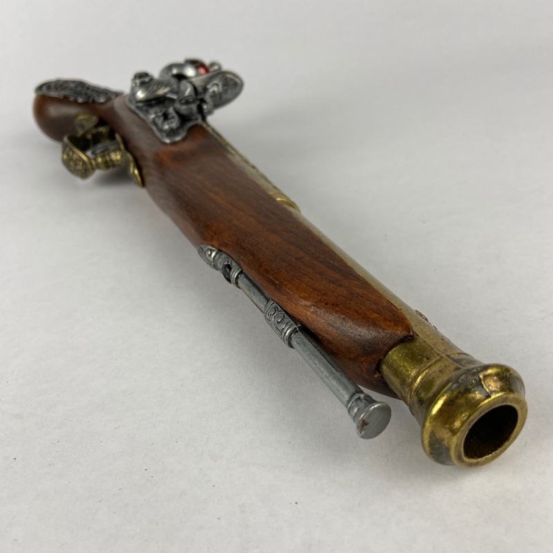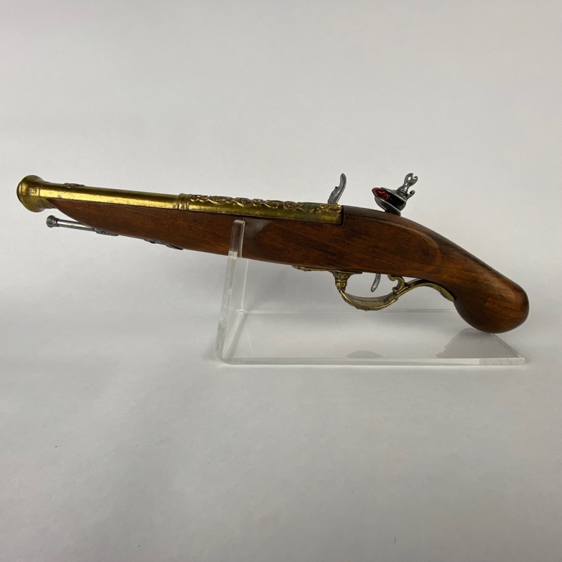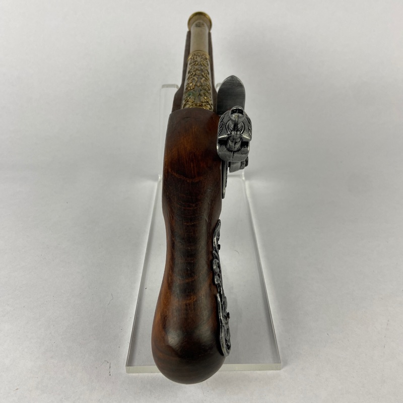 Ejemplar fabricado en madera y metal, con culata de madera y cañón con terminación ensanchada en latón. Presenta mecanismo de chispa simulado con platina decorada y martillo de formas ornamentales, acompañado de baqueta metálica inferior. Los elementos metálicos muestran decoración en relieve de estilo floral, característica de las pistolas inglesas del siglo XVIII. Destaca la elegancia de la línea general del arma y la presencia de detalles decorativos que refuerzan su carácter histórico.