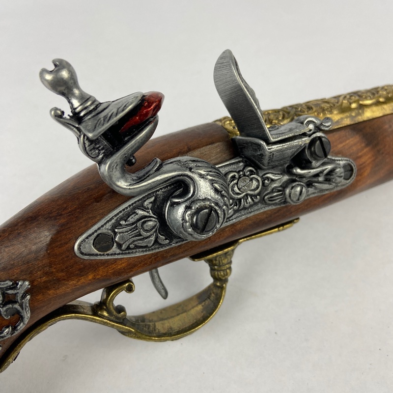 Reproducción decorativa de pistola de chispa inglesa del siglo XVIII, inspirada en las armas utilizadas en Gran Bretaña durante este periodo, tanto por oficiales como por civiles para defensa personal y uso cotidiano. Las pistolas inglesas de esta época destacaban por su equilibrio entre funcionalidad y decoración, siendo habituales en contextos militares y de viaje.