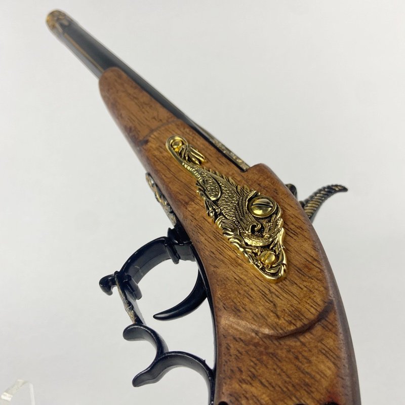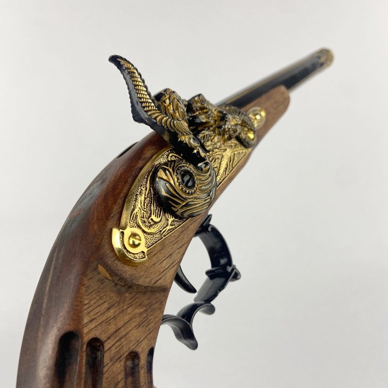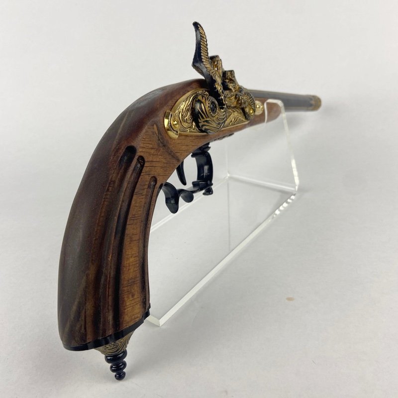Reproducción decorativa de pistola de chispa civil italiana inspirada en modelos europeos del siglo XIX, actualmente descatalogada. Este tipo de pistolas civiles se utilizaba habitualmente para defensa personal y como armas de prestigio, destacando por su cuidada ornamentación y elegancia.