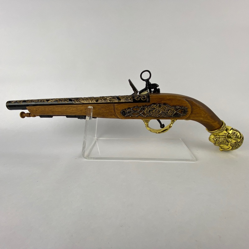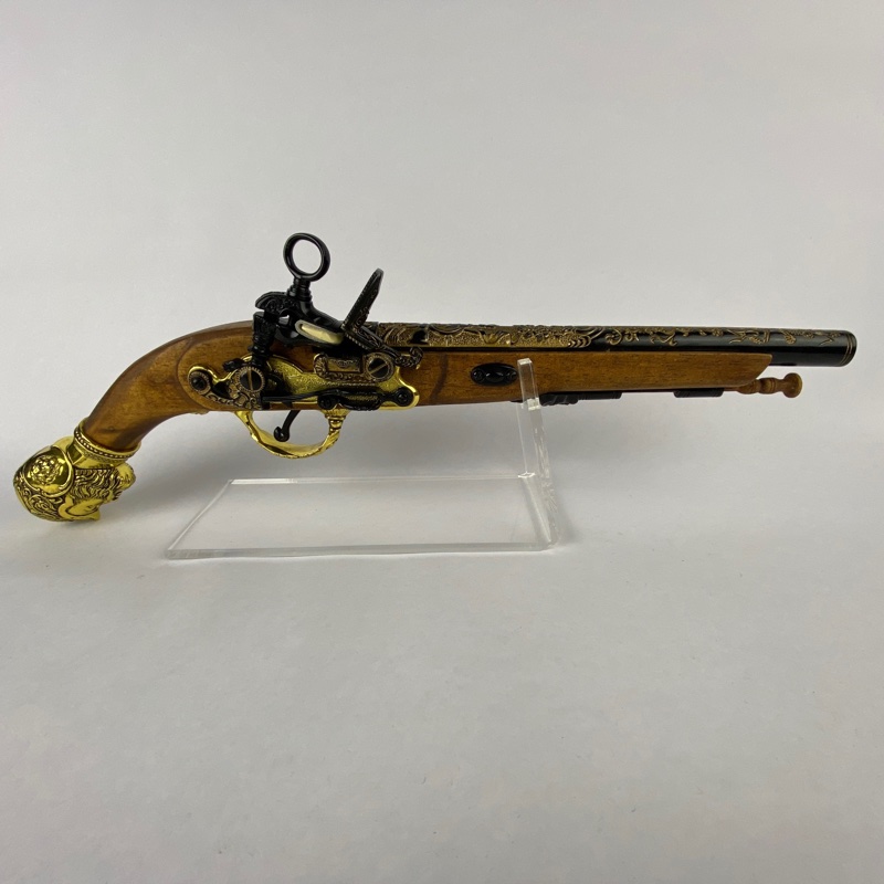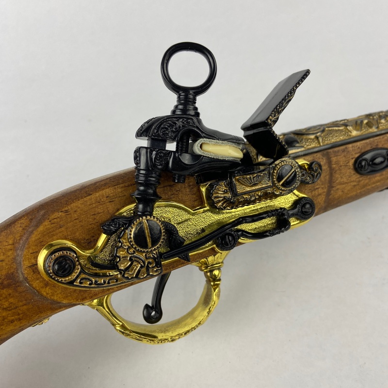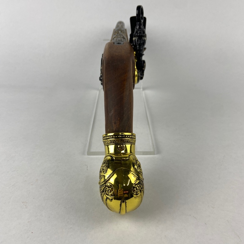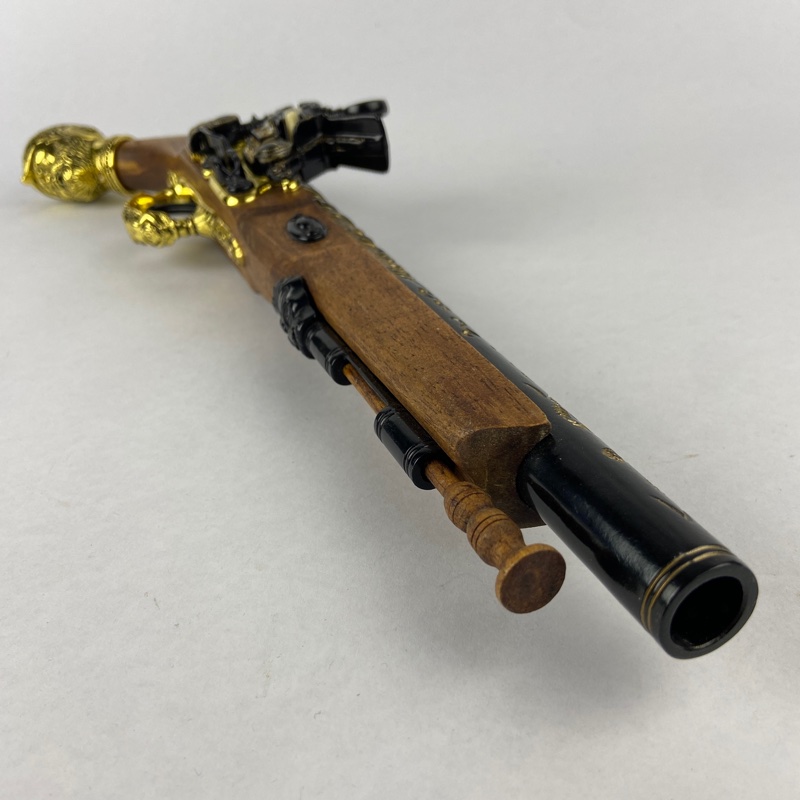 Ejemplar fabricado con empuñadura de madera pulida y cañón metálico con acabado negro damasquinado en oro. Presenta platina decorada con grabados ornamentales de estilo clásico y mecanismo de chispa decorativo, acompañado de baqueta metálica inferior. La empuñadura termina en pomo metálico.