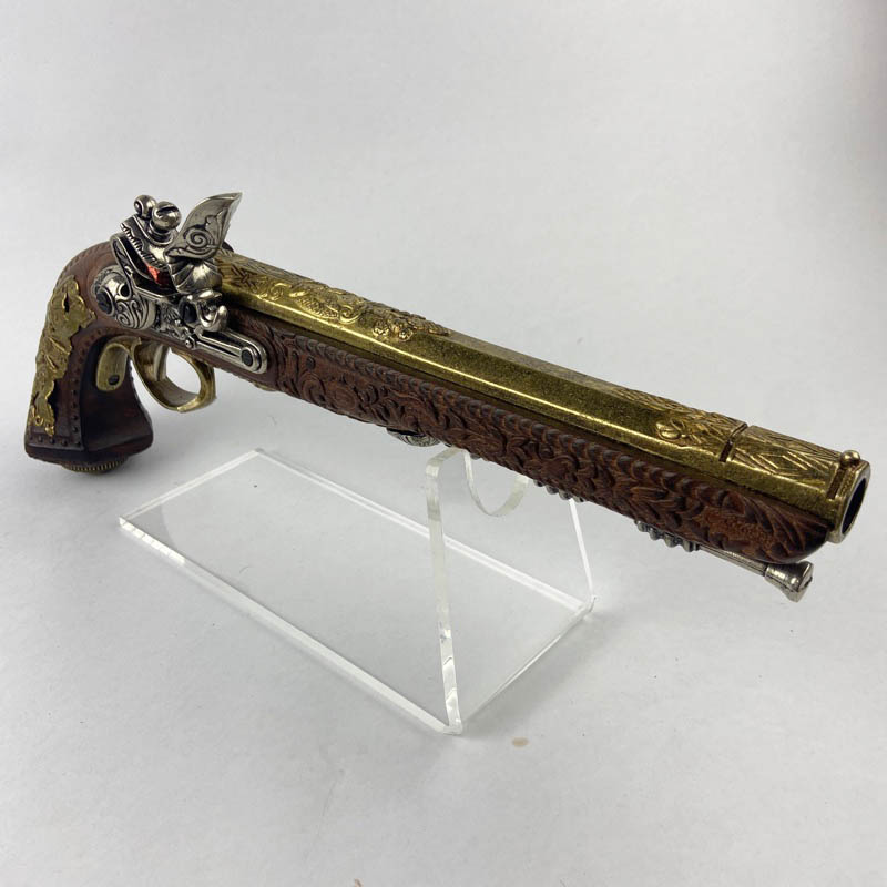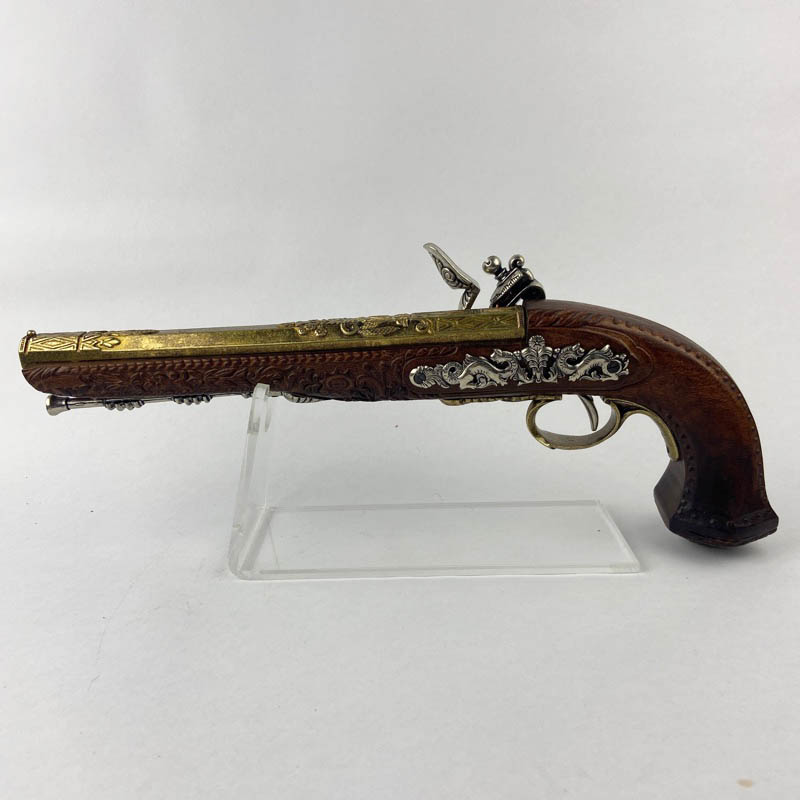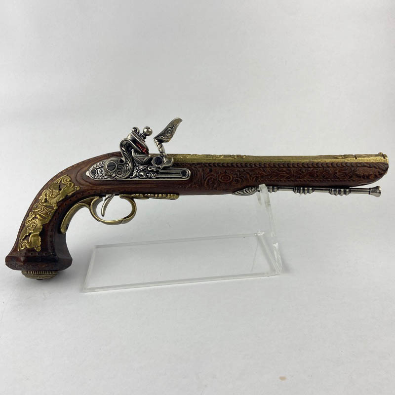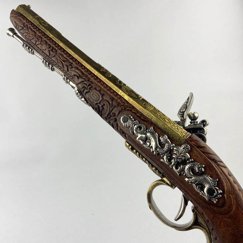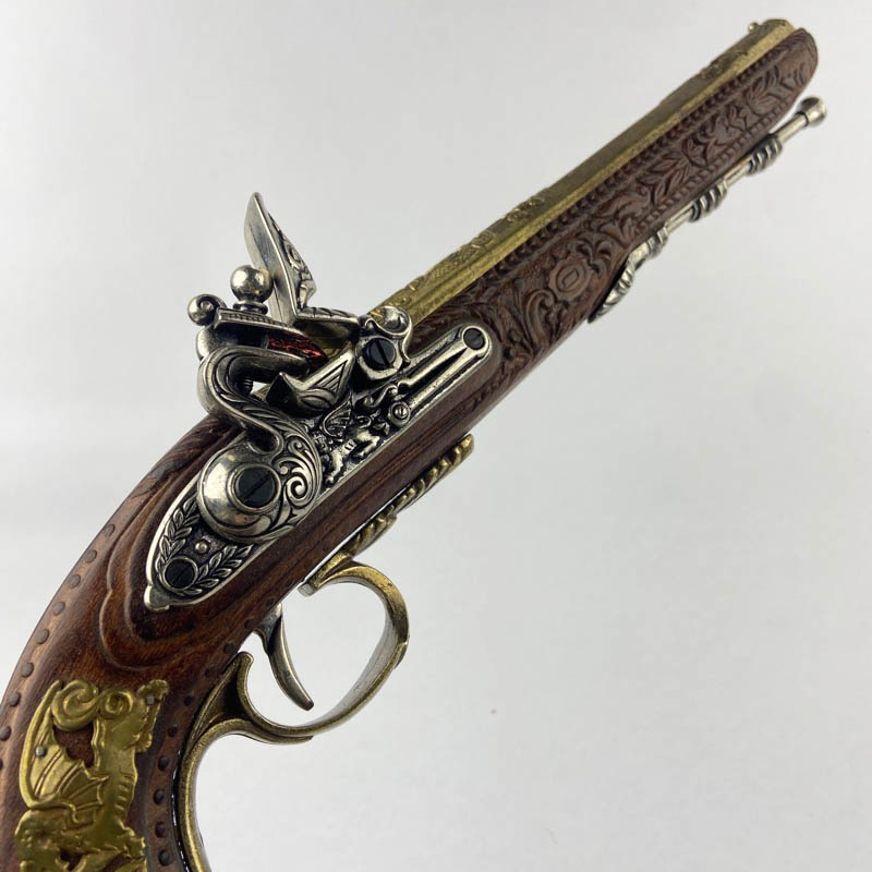 Ejemplar fabricado en metal y madera con ricos detalles ornamentales en el cañón y la empuñadura, decorados con relieves de estilo clásico. Presenta mecanismo simulado de chispa con martillo móvil y baqueta inferior decorativa, características propias de las pistolas de duelo de la época. Pieza ideal para colección o ambientación histórica.