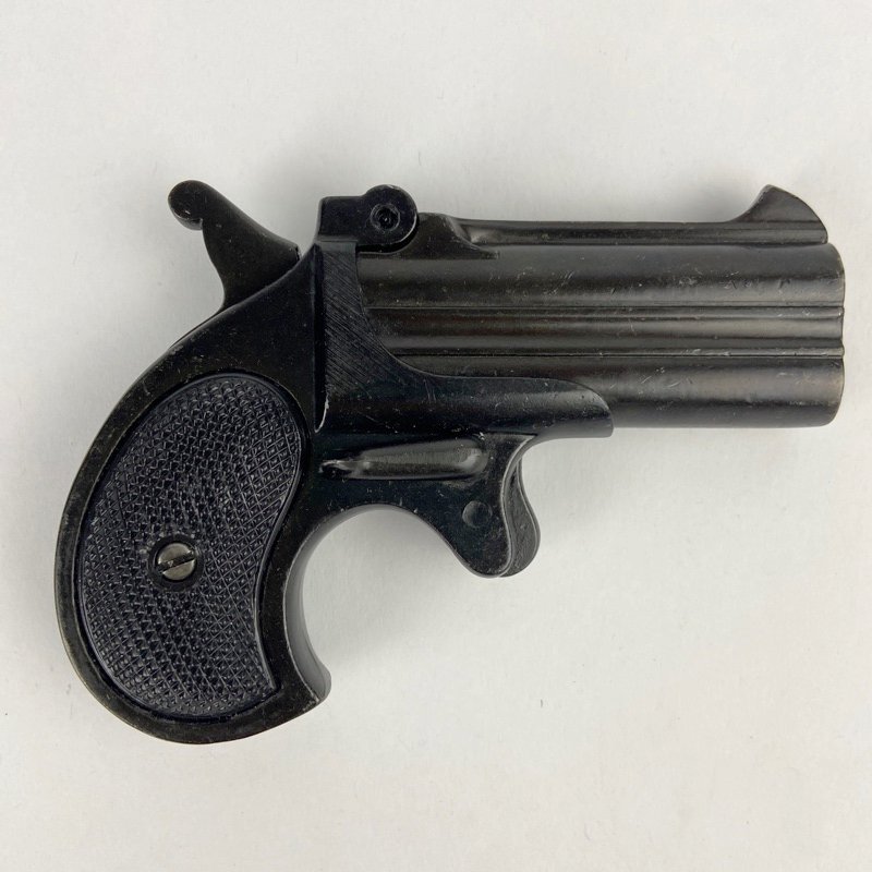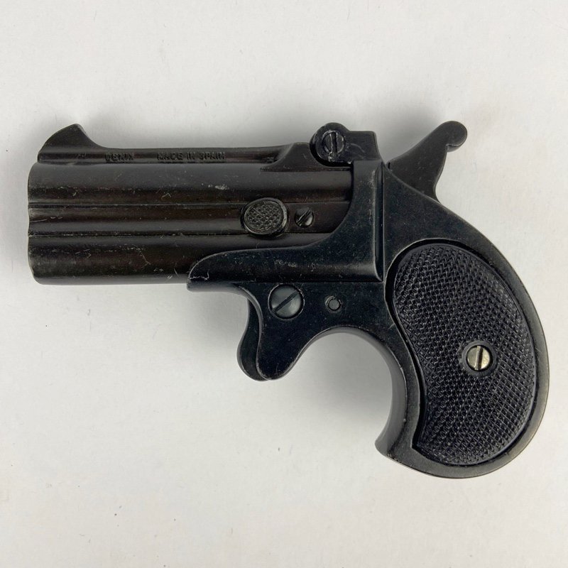 Reproducción de la pistola Derringer de bolsillo utilizada en Estados Unidos durante la segunda mitad del siglo XIX. Este tipo de arma compacta se popularizó en el periodo del Oeste americano por su tamaño reducido y facilidad para ocultarla, siendo habitual entre viajeros, jugadores y personajes del mundo del juego y los salones del Mississippi.