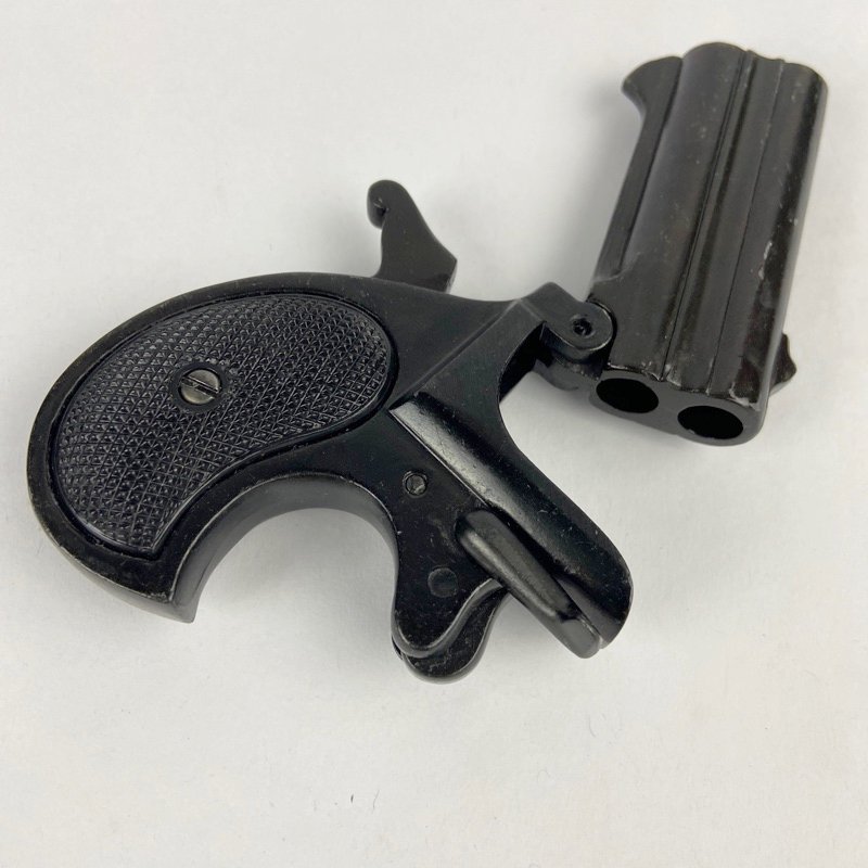 La réplica reproduce el diseño clásico con dos cañones superpuestos, martillo externo y empuñadura compacta. El sistema permite bascular el bloque de cañones para mostrar las dos recámaras, simulando el funcionamiento del arma original. Está fabricada en metal con cachas sintéticas y mecanismo decorativo de carga y disparo, pensada para colección o ambientación histórica.