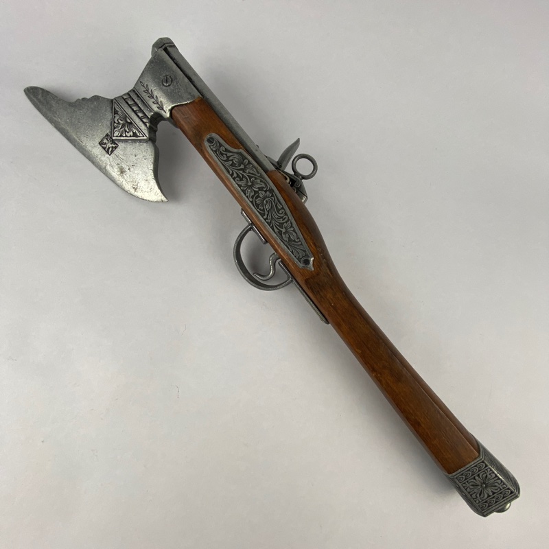 Reproducción decorativa de pistola hacha alemana del siglo XVII, inspirada en las armas combinadas utilizadas en Europa Central durante este periodo. Este tipo de armas híbridas, que combinaban arma de fuego de chispa con hoja de hacha, eran empleadas principalmente por guardias, jinetes y personal de seguridad como arma de defensa personal y de combate cercano.