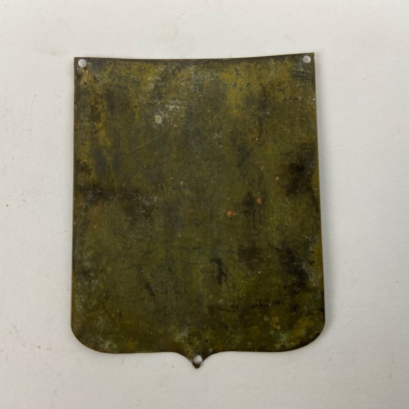Fabricado en latón esmaltado, con orificios en las esquinas para su fijación. Reverso liso sin marcajes visibles. Medidas: 4,5 x 6 cm. Conserva desgaste y pátina acorde a su antigüedad, con pequeñas pérdidas de esmalte visibles.