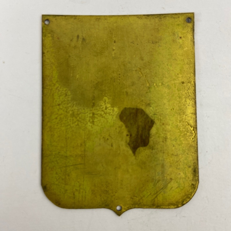 Fabricado en latón esmaltado, con orificios en las esquinas para su fijación. Reverso liso sin marcajes visibles. Medidas: 4,5 x 6 cm. Conserva desgaste y pátina acorde a su antigüedad, con pequeñas pérdidas de esmalte visibles.