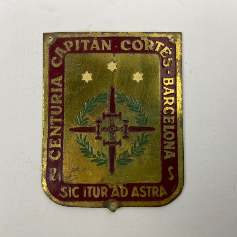 Escudo metálico esmaltado en latón correspondiente a la Centuria Capitán Cortés de Falange Española. Presenta forma de escudo con borde rojo y la inscripción Centuria Capitán Cortés y lema Sic itur ad astra en la parte inferior. En el centro aparece una Cruz Laureada de San Fernando.