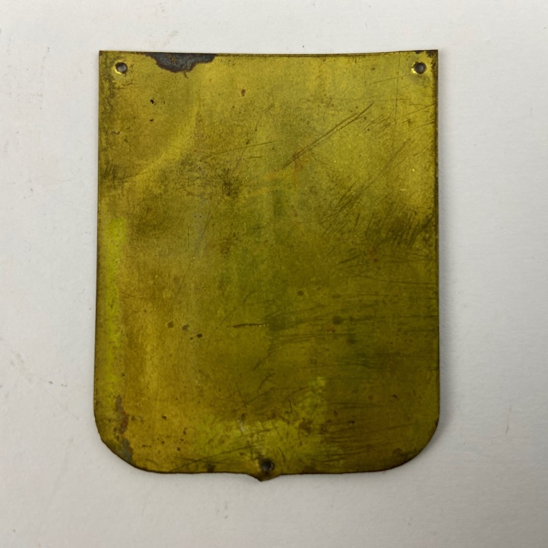Fabricado en latón esmaltado, con orificios en las esquinas para su fijación. Reverso liso sin marcajes visibles. Medidas: 4,5 x 6 cm. Conserva desgaste y pátina acorde a su antigüedad, con pequeñas pérdidas de esmalte visibles.