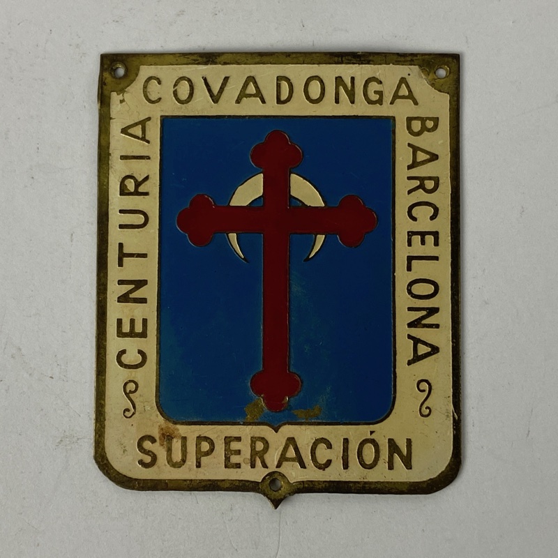 Escudo metálico esmaltado en latón correspondiente a la Centuria Covadonga de Falange Española. Presenta la inscripción Centuria Covadonga Barcelona y el lema Superación en el contorno. En el centro figura una cruz de color rojo sobre fondo azul, acompañada de media luna blanca.