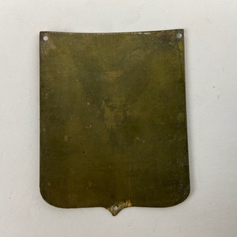 Fabricado en latón esmaltado, con orificios en las esquinas para su fijación. Reverso liso sin marcajes visibles. Medidas: 4,5 x 6 cm. Conserva desgaste y pátina acorde a su antigüedad, con pequeñas pérdidas de esmalte visibles.