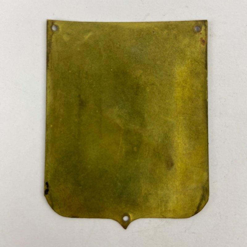 Fabricado en latón esmaltado, con orificios en las esquinas para su fijación. Reverso liso sin marcajes visibles. Medidas: 4,5 x 6 cm. Conserva desgaste y pátina acorde a su antigüedad, con pequeñas pérdidas de esmalte visibles.