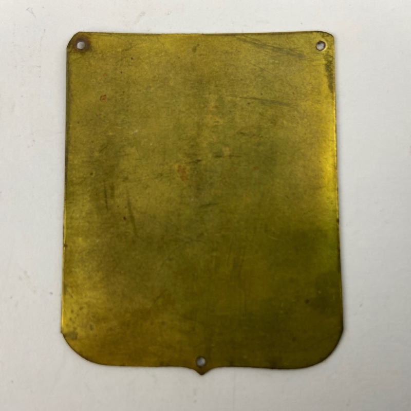 Fabricado en latón esmaltado, con orificios en las esquinas para su fijación. Reverso liso sin marcajes visibles. Medidas: 4,5 x 6 cm. Conserva desgaste y pátina acorde a su antigüedad, con pequeñas pérdidas de esmalte visibles.
