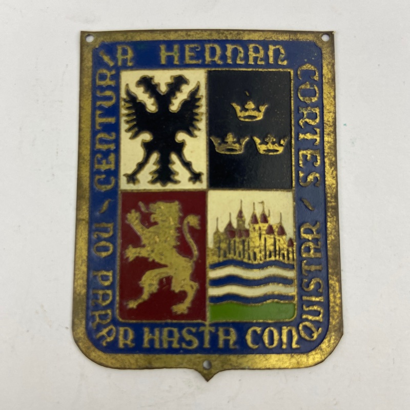 Escudo metálico esmaltado en latón correspondiente a la Centuria Hernán Cortés de Falange Española. Presenta forma de escudo con borde azul y la inscripción Centuria Hernán Cortés y lema No parar hasta conquistar en el contorno. En el centro aparece un escudo cuartelado con águila bicéfala, tres coronas, león rampante y castillo sobre ondas, escudo de armas de Hernán Cortes.