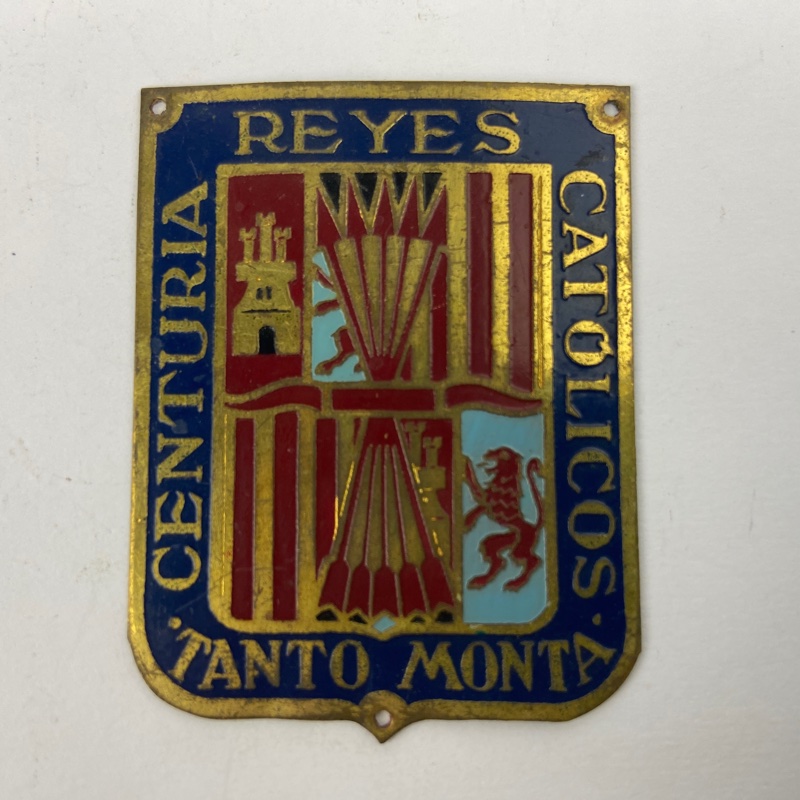 Escudo metálico esmaltado en latón correspondiente a la Centuria Reyes Católicos de Falange Española. Presenta forma de escudo con borde azul y la inscripción Centuria Reyes Católicos y lema Tanto monta en el contorno. En el centro aparece un escudo con los símbolos heráldicos asociados a los Reyes Católicos, incluyendo castillo, león y haces de flechas.