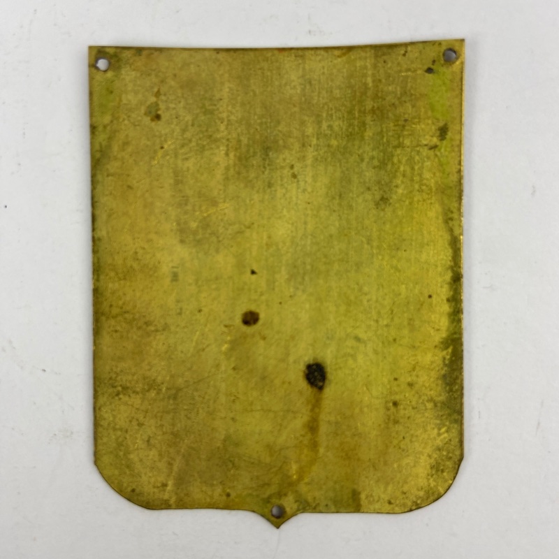 Fabricado en latón esmaltado, con orificios en las esquinas para su fijación. Reverso liso sin marcajes visibles. Medidas: 4,5 x 6 cm. Conserva desgaste y pátina acorde a su antigüedad, con pequeñas pérdidas de esmalte visibles.