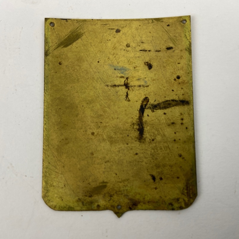 Fabricado en latón esmaltado, con orificios en las esquinas para su fijación. Reverso liso sin marcajes visibles. Medidas: 4,5 x 6 cm. Conserva desgaste y pátina acorde a su antigüedad, con pequeñas pérdidas de esmalte visibles.