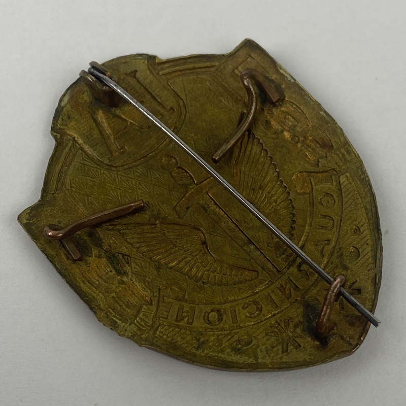 Fabricada en metal estampado con relieve y esmaltado en rojo y azul, mostrando el emblema característico del cuerpo. En el reverso conserva aguja móvil central y dos enganches laterales para su correcta fijación. Pieza original en buen estado general, Falta un pequeño trozo de esmalte.