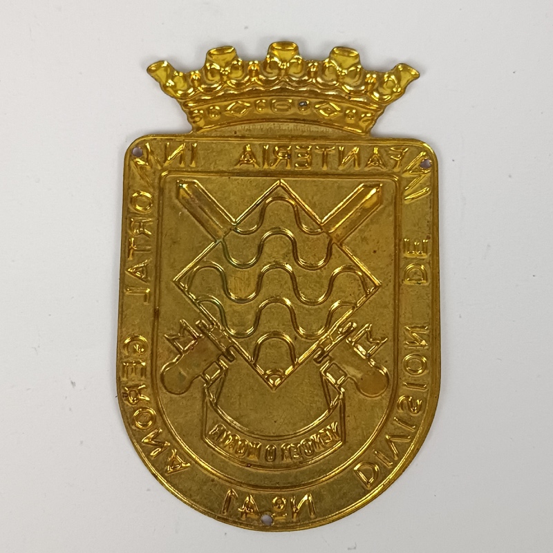 Placa o chapa para coser en el brazo del uniforme de los miembros de la División de Infantería Inmemorial Gerona nº 41, en perfecto estado de conservación. Estampada en latón, de una sola pieza, con orificios para coser el escudo al uniforme.