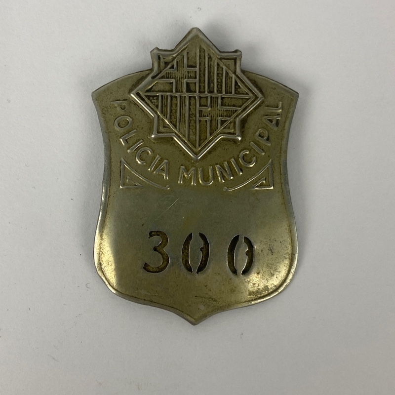 Placa para gorra de plato, perteneciente a la Policía Municipal de Barcelona, con número de serie en el frontal de la misma, troquelado. Sin enganche posterior.