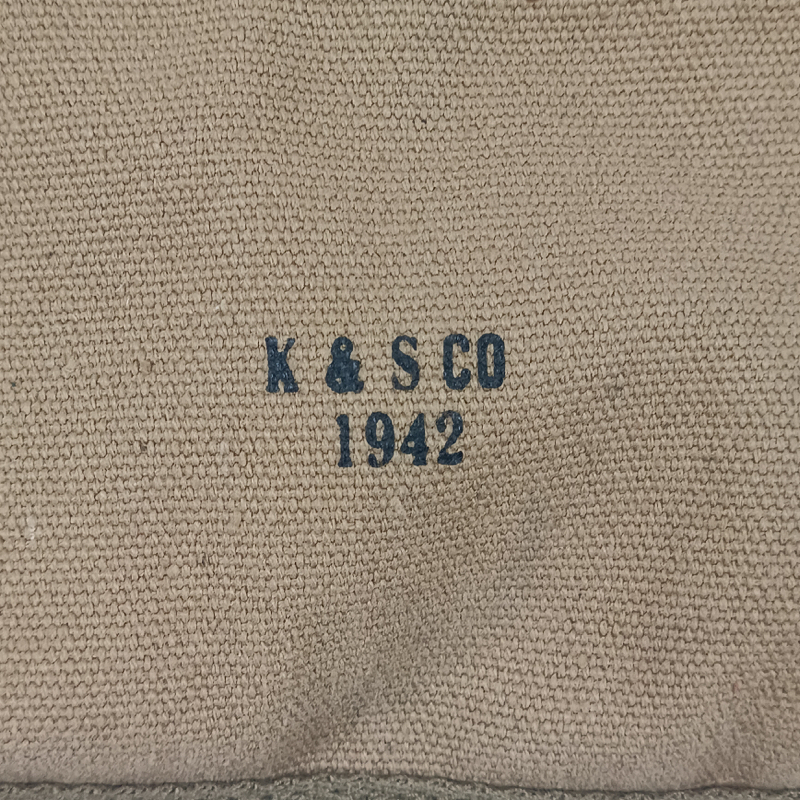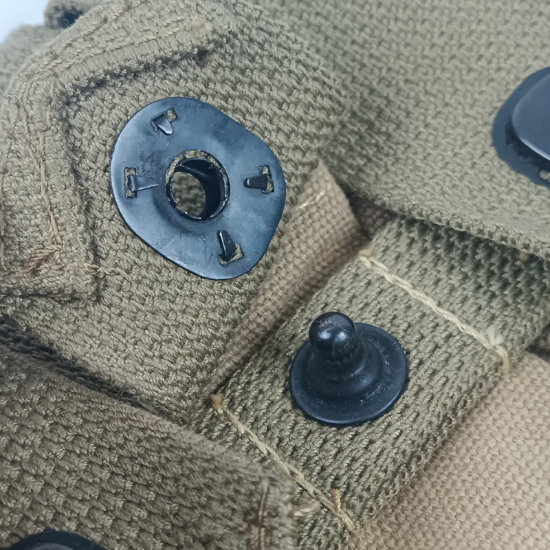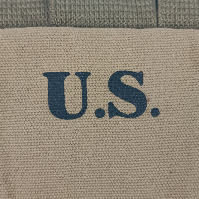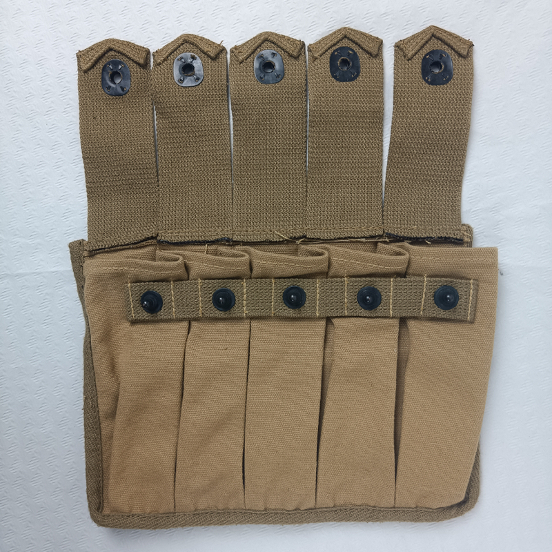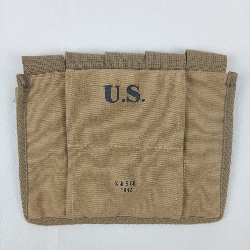 Reproducción del portacargador para subfusil Thompson M1 del Ejército Americano durante la Segunda Guerra Mundial. Fabricado en lona de color caqui con cinco compartimentos individuales y cierre mediante botones a presión. Marcado en la parte posterior con “U.S.” y fabricante K & S CO 1942.