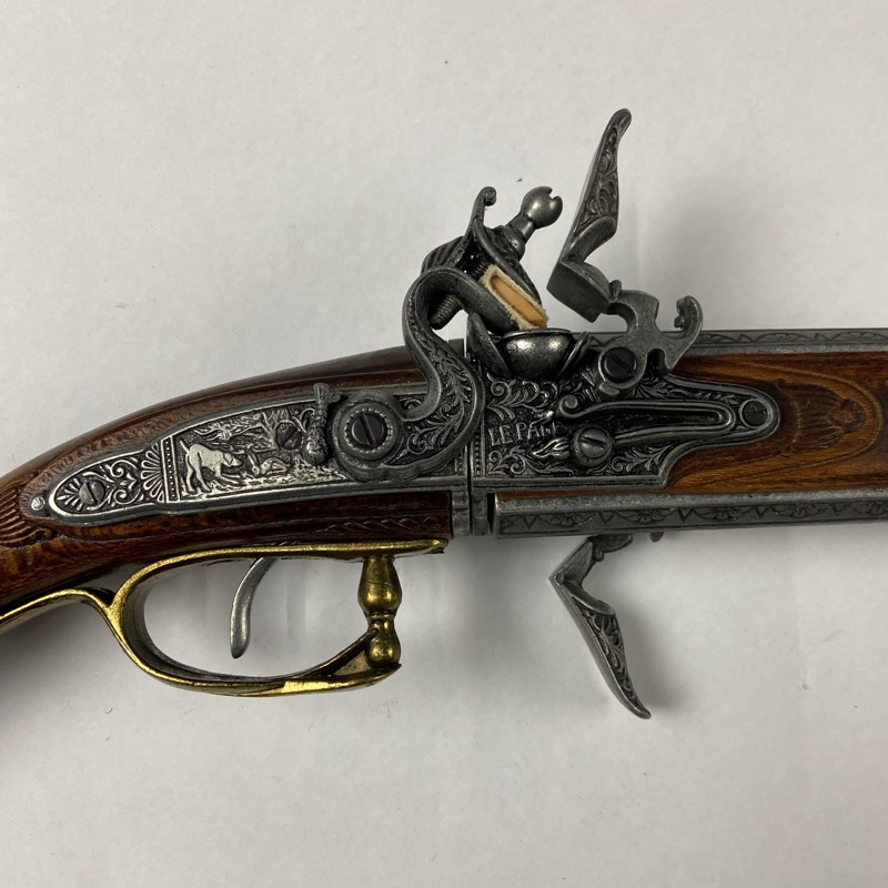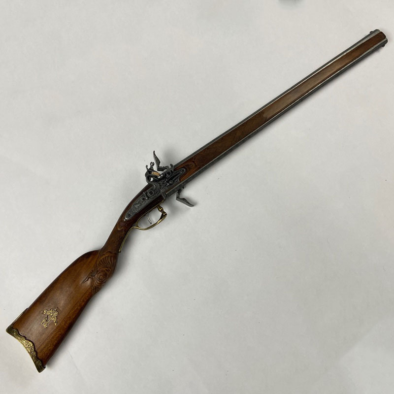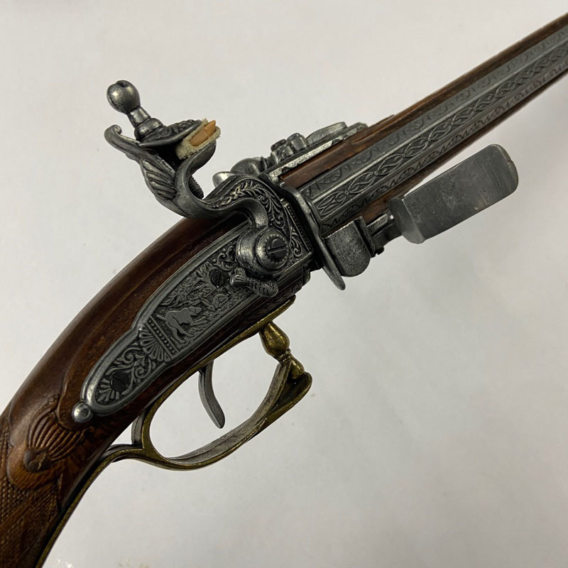 Reproducción de rifle de chispa de estilo europeo del siglo XVIII con sistema de dos cañones superpuestos giratorios. Este tipo de arma de avancarga utilizaba piedra de sílex para producir la chispa que encendía la pólvora, permitiendo el disparo tras cargar manualmente el proyectil por la boca del cañón.