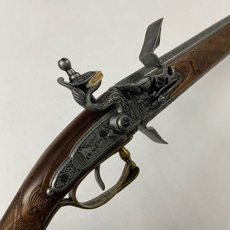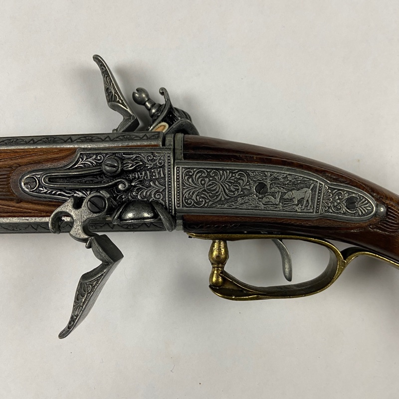 La pieza presenta culata de madera con grabados decorativos, cantonera metálica ornamentada y armazón metálico ricamente decorado con escenas grabadas. El mecanismo reproduce martillo, cazoleta y gatillo característicos de las armas de avancarga.