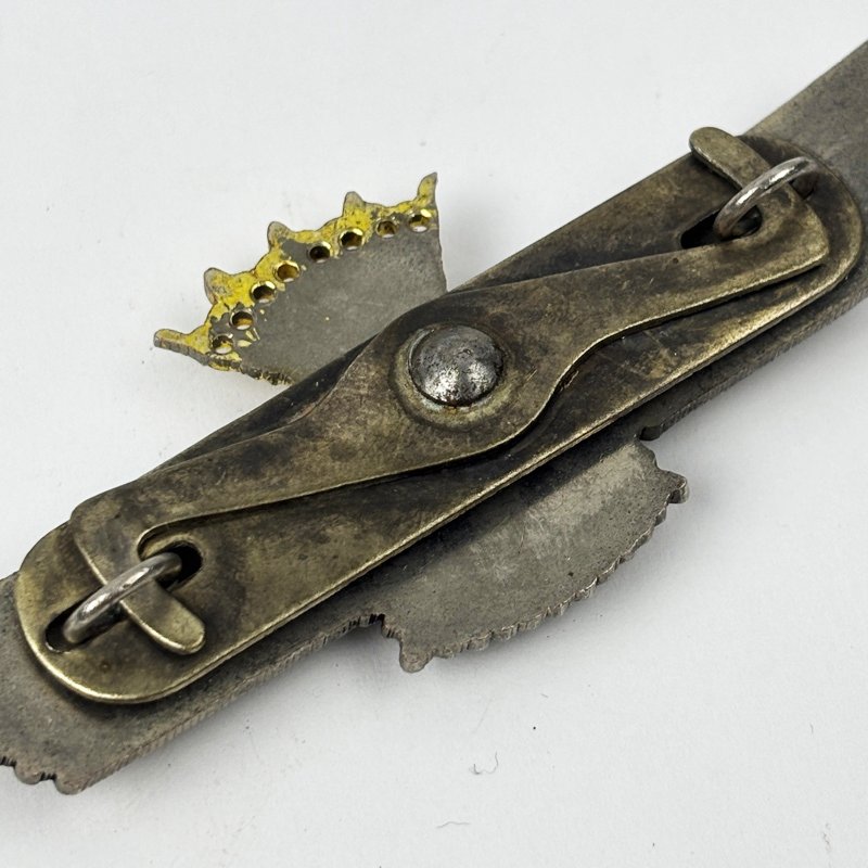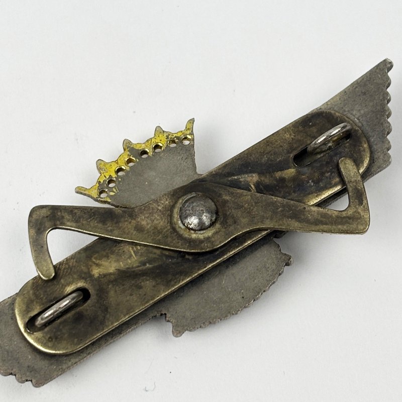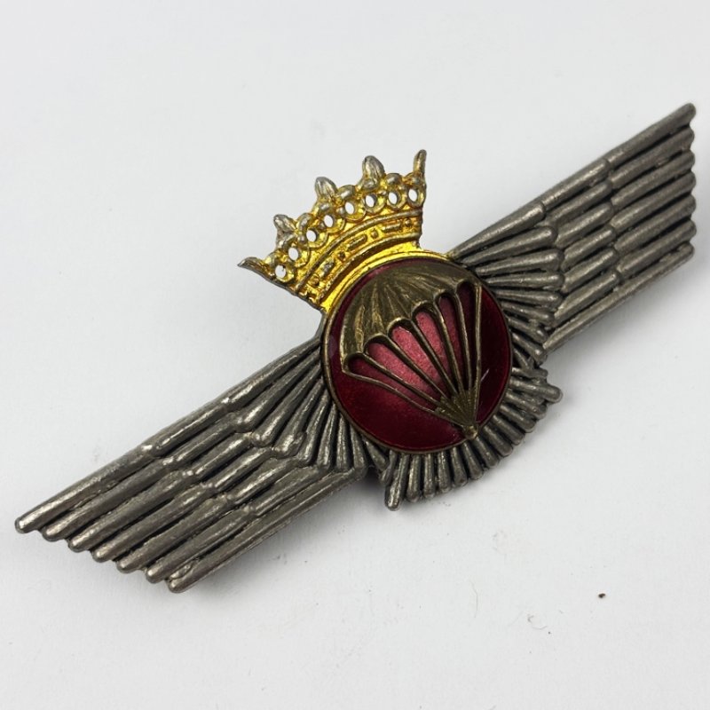 Rokiski para Paracaidista de 7 Cuerdas, segundo modelo utilizado a partir de 1964 con corona imperial y 7 cuerdas en el paracaídas. Insignia del paracaídas formada en dos piezas. En la parte posterior presenta dos enganches con el gancho de pinza correspondiente.