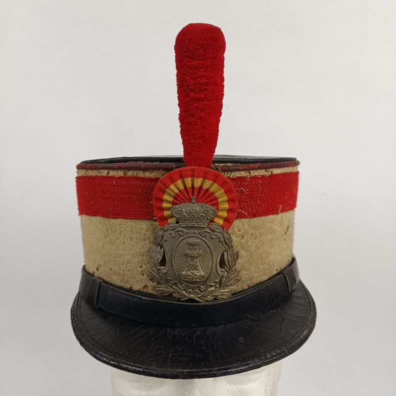 En la parte frontal figura una placa metálica para ingenieros, formado por el escusón de Alfonso XIII rodeado de laureles bajo una corona Alfonsina, tras la cual incorpora una escarapela con los colores nacionales. En la parte superior un penacho rojo.