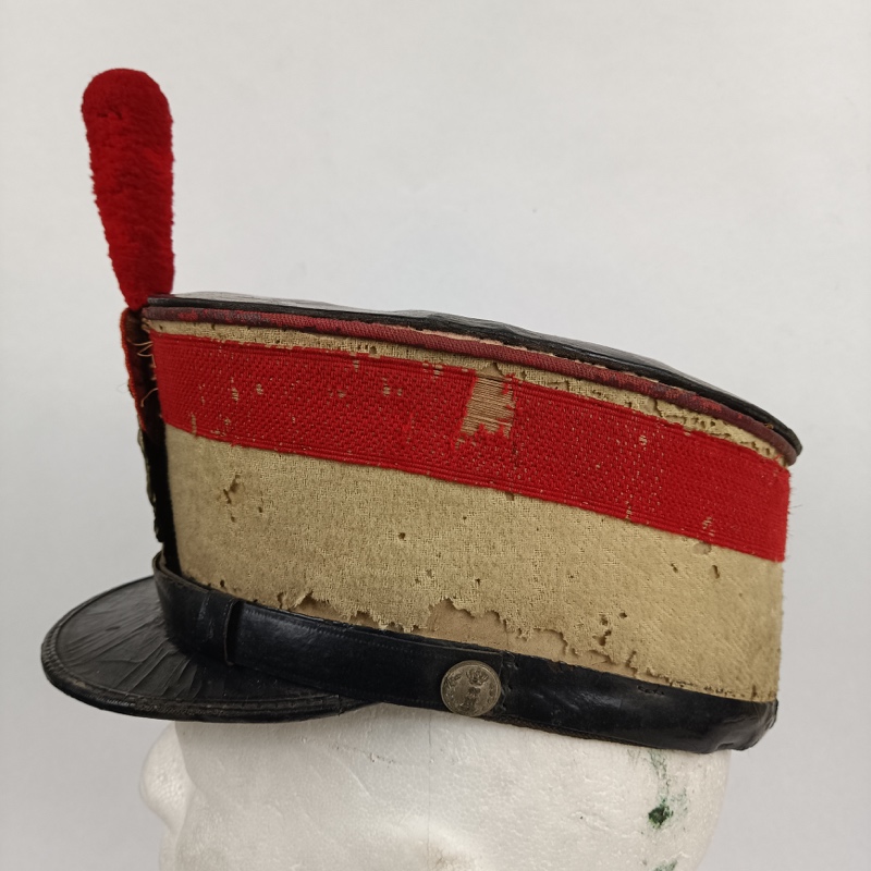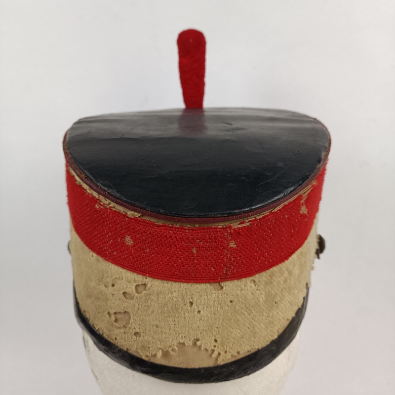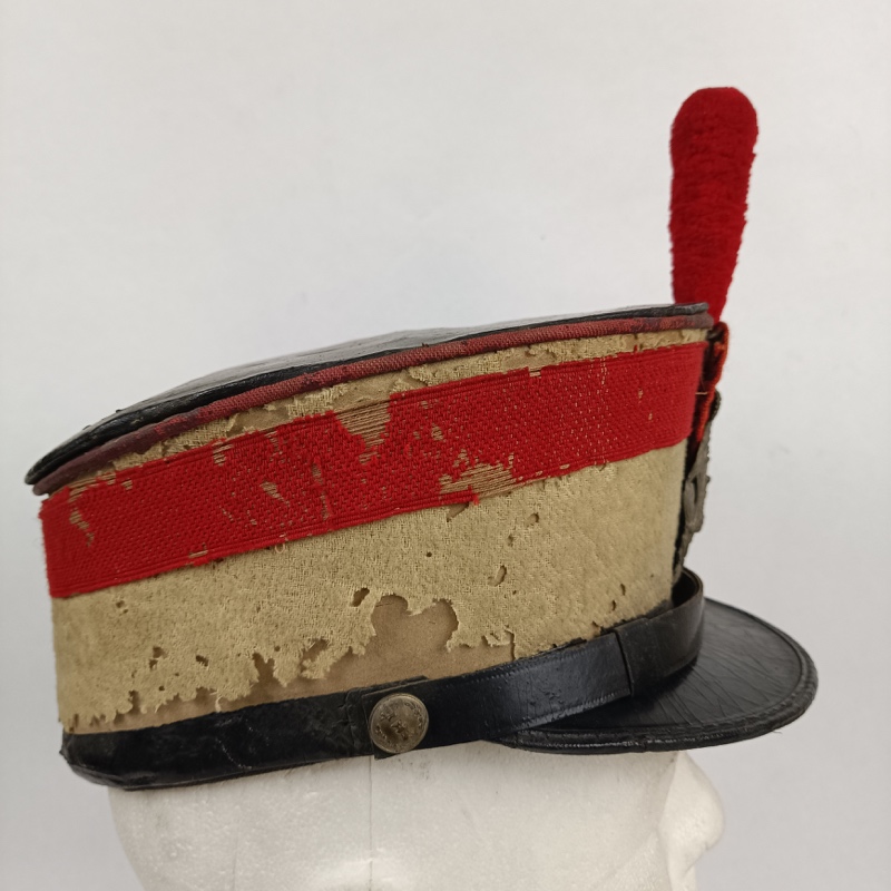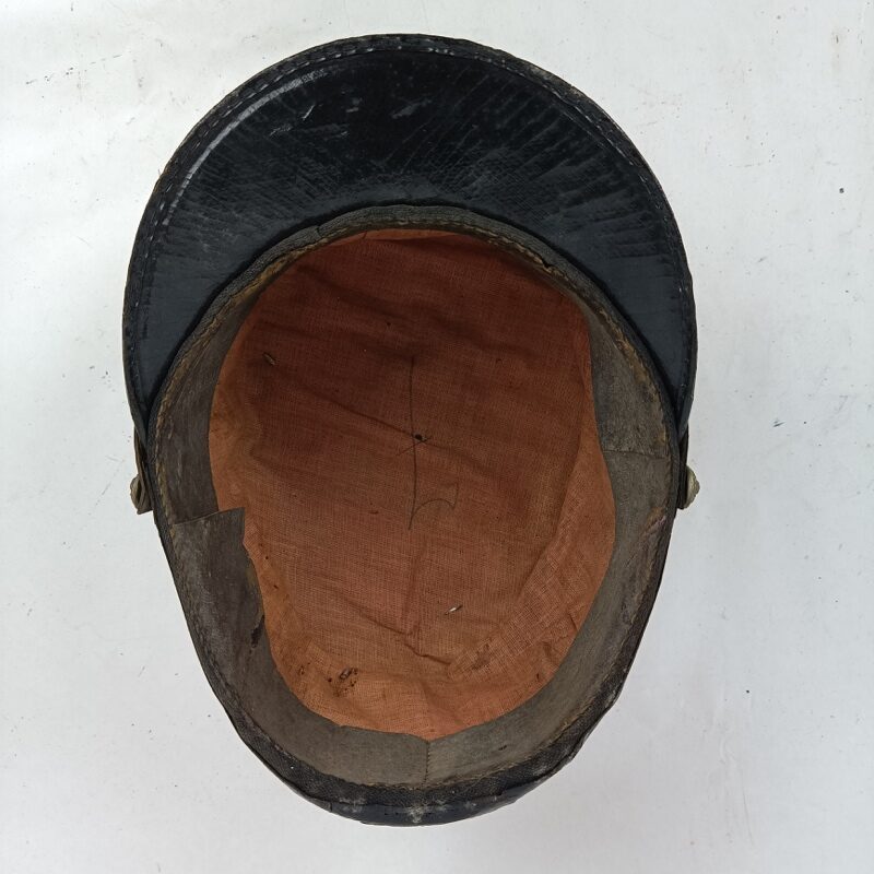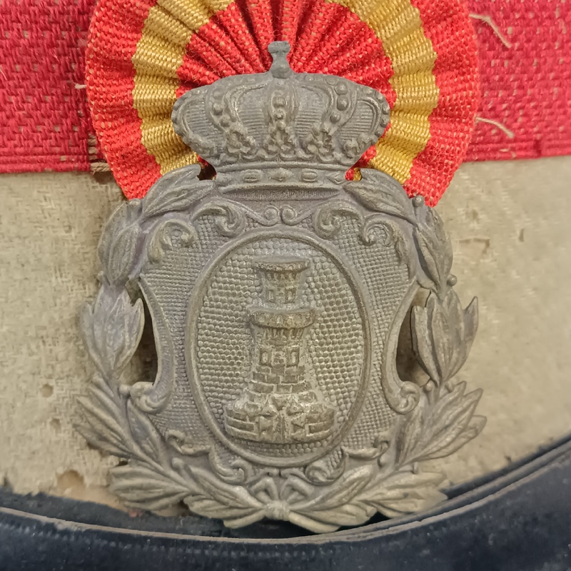 Parte superior del sombrero, visera y barboquejo de charol completo sin roturas, un poco cuarteado por el paso del tiempo pero entero. El barboquejo se une al gorro mediante dos botones de latón dorados con el escudo del Castillo de Ingenieros en relieve.