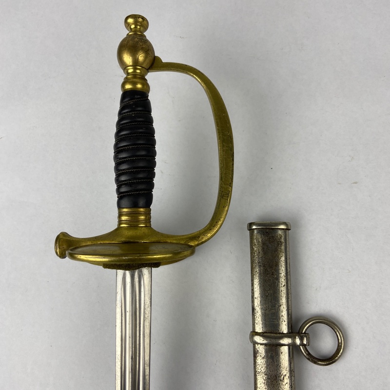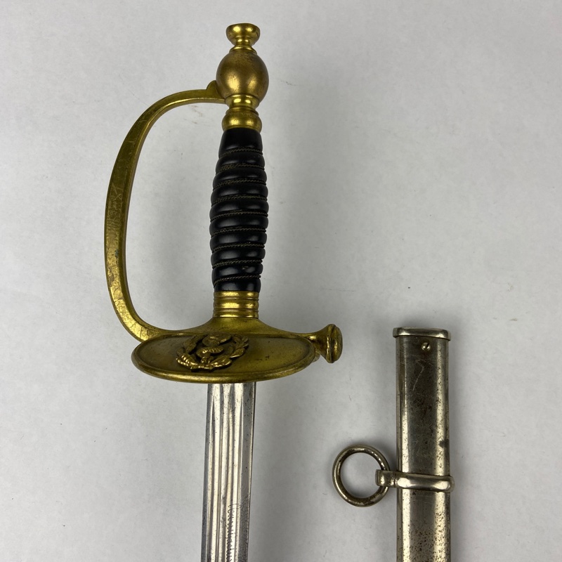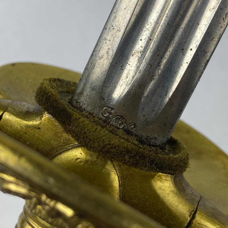 Hoja recta de acero con acanaladuras longitudinales, característica del modelo reglamentario de oficiales adoptado en Francia en 1872 y utilizado ampliamente por oficiales de distintos cuerpos, incluido el servicio sanitario.