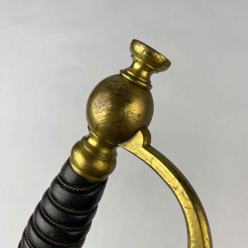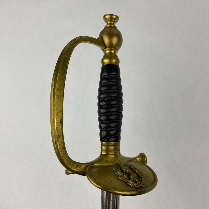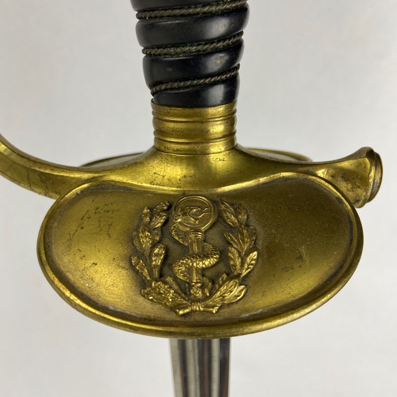 Sable de Oficial Médico modelo 1872 con guarnición de latón y guardamano completo con pomo globular. Empuñadura negra y alambrado trenzado. En la concha frontal aparece el emblema del Cuerpo de Sanidad Militar francés, formado por el bastón de Esculapio con la serpiente enrollada, rodeado por una corona de laurel.