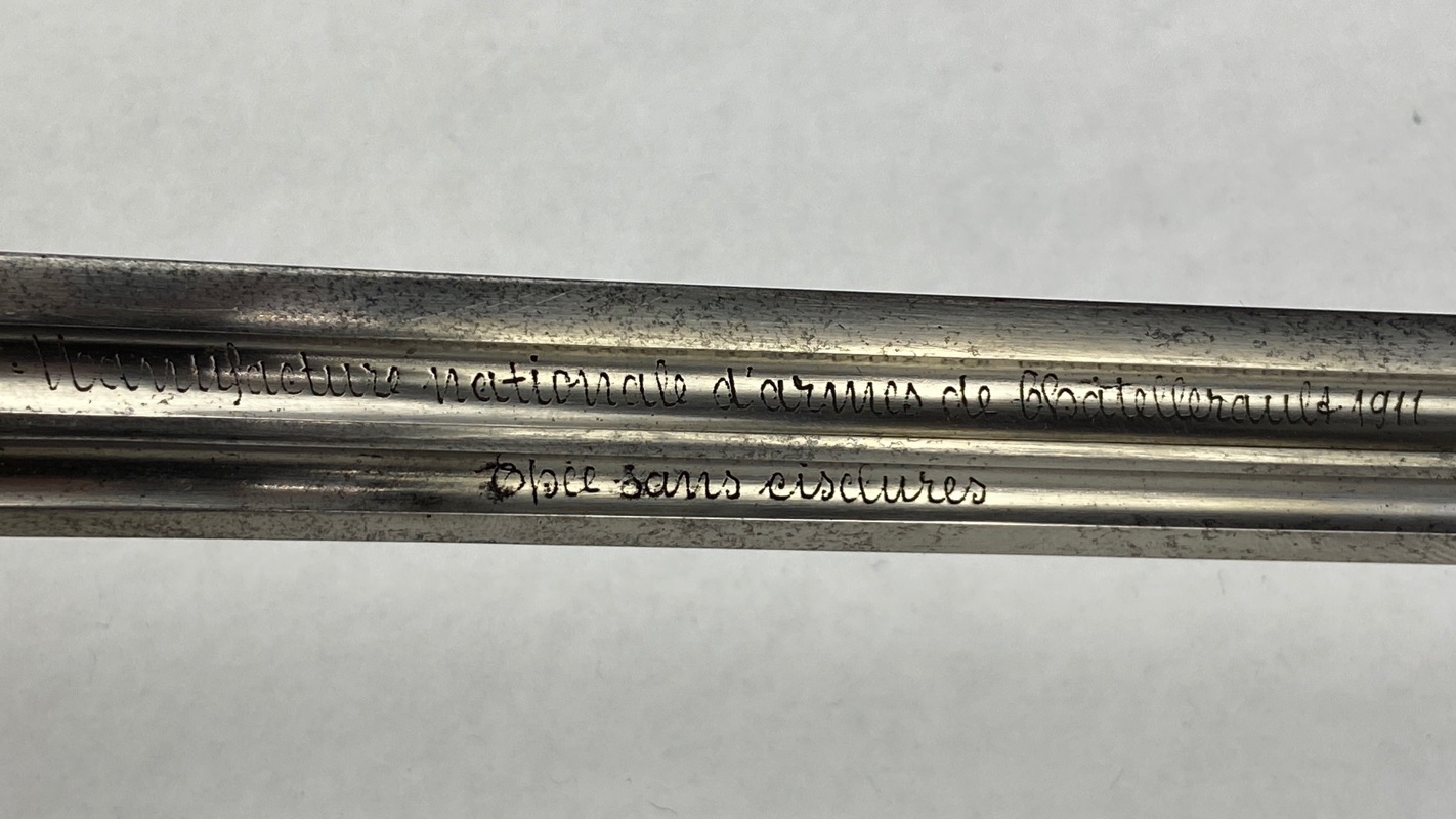 En el centro de la hoja aparece la inscripción “Manufacture Nationale d’Armes de Châtellerault 1911” que indica fecha y fabricación en una de las principales fábricas militares francesas. La hoja presenta además punzones de control de la fábrica en la base de la misma.