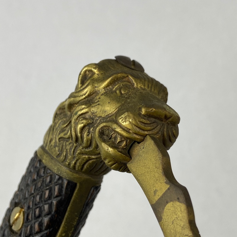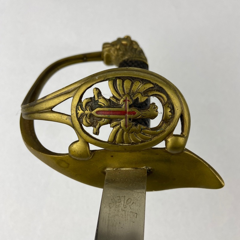 Guarnición metálica con Águila de San Juan y Cruz de Santiago en la cazoleta. Empuñadura en madera cuadrillada, fijada mediante dos tornillos pasantes que unen ambos extremos de la guarnición.