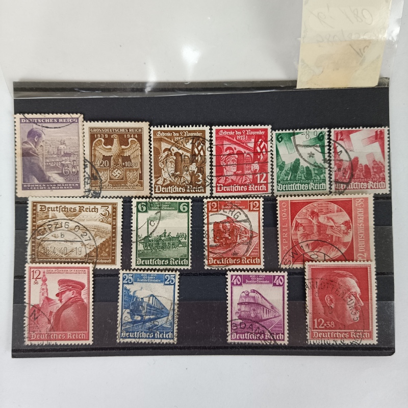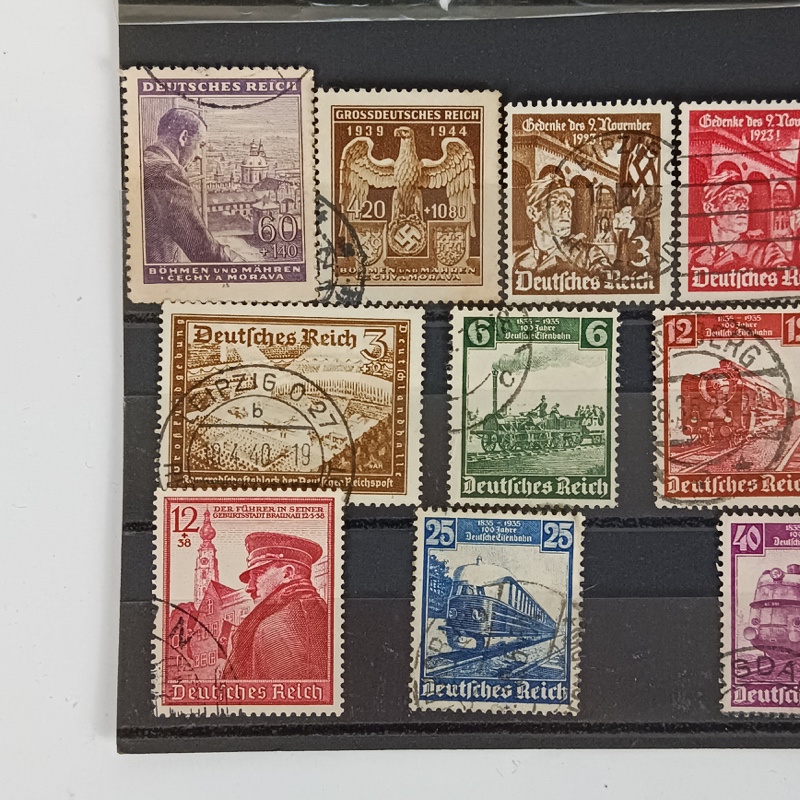Sellos alemanes de la Segunda Guerra Mundial y tercer Reich, originales de epoca, sobre un soporte de cartulina para presentacion. Conjunto o colección de sellos auténticos, antiguos.