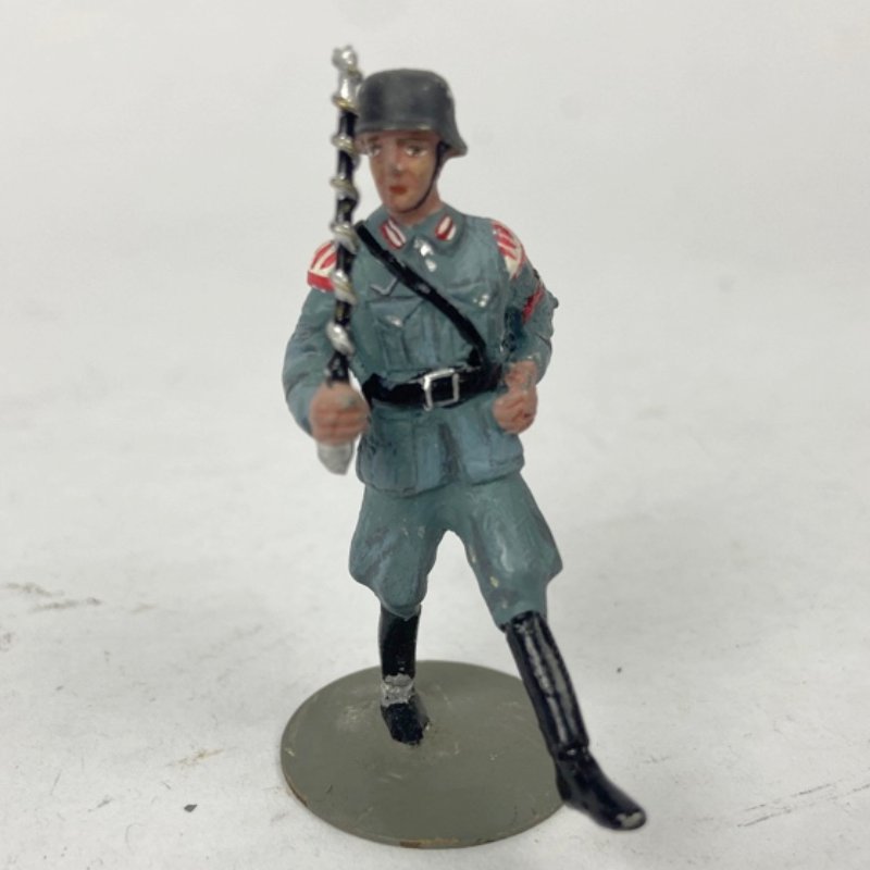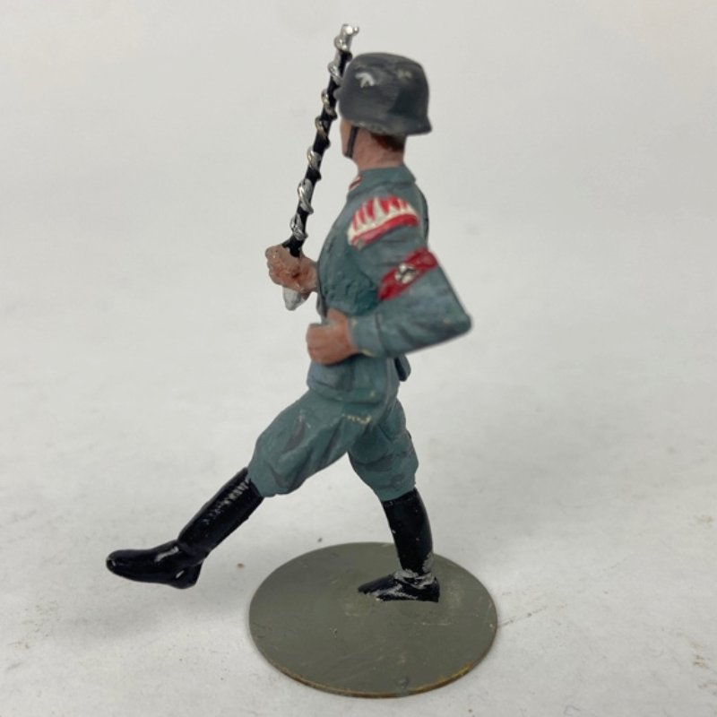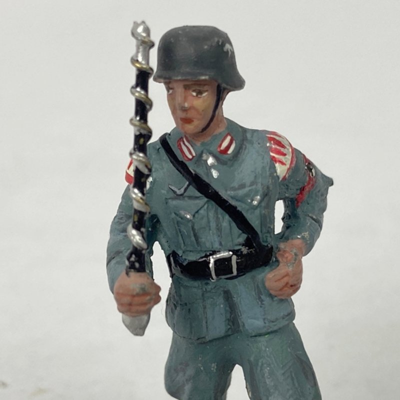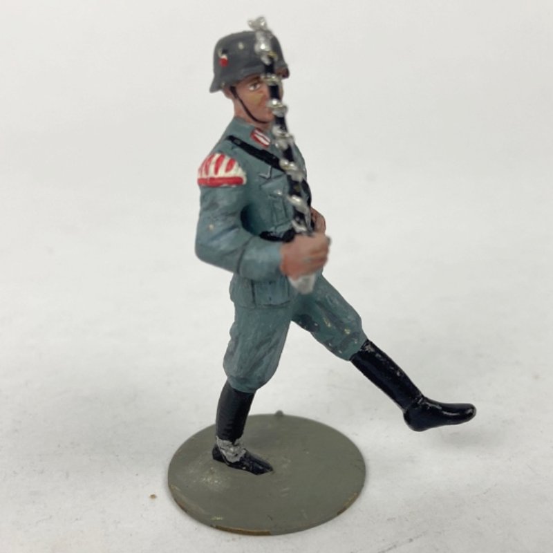 Soldado de plomo Alemán desfilando vestido en uniforme de gala para músico, con batuta para dirigir. Waffenfarbe de color rojo.