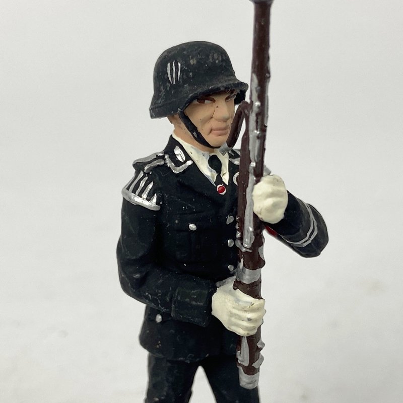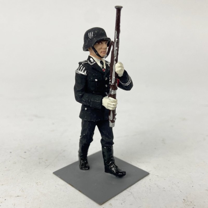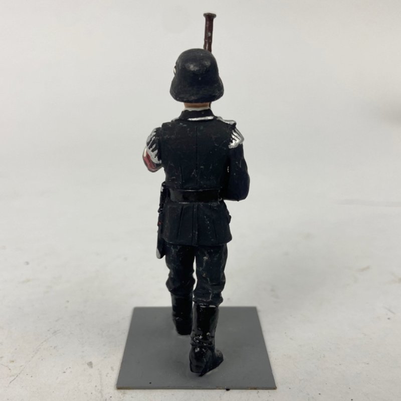 Soldado de plomo Alemán desfilando vestido en uniforme de músico de la Waffen SS, con su correspondiente instrumento.