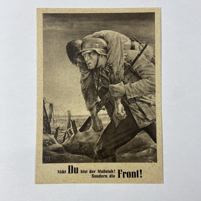 En el centro se ve el dibujo de un soldado alemán llevando un compañero herido. Debajo se lee “Nicht Du bist der Maßstab! Sondern Die front!” (¡Tú no eres estándar! ¡El frente sí!).