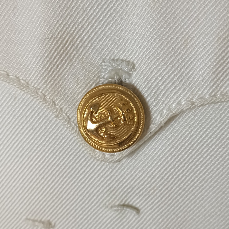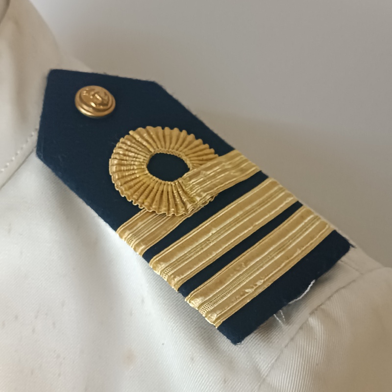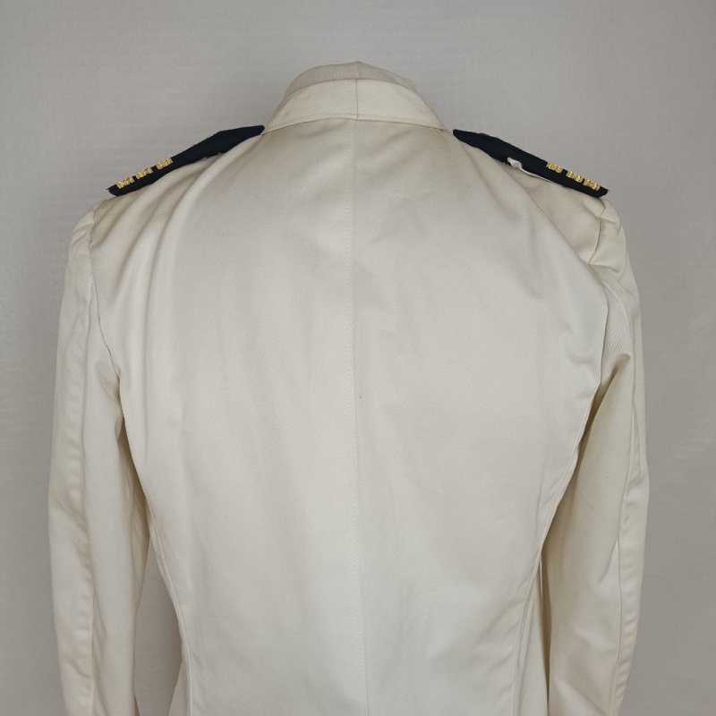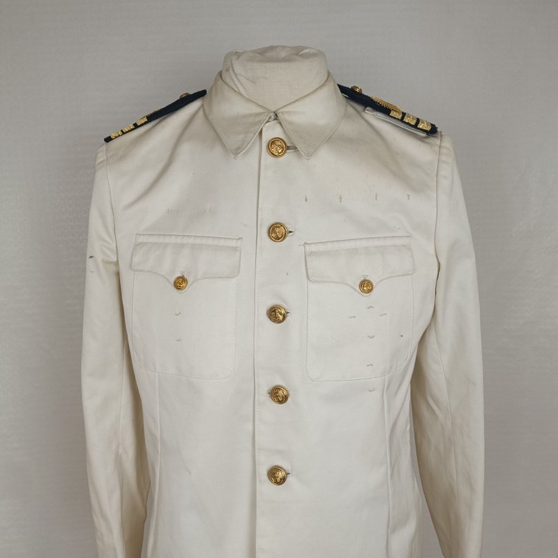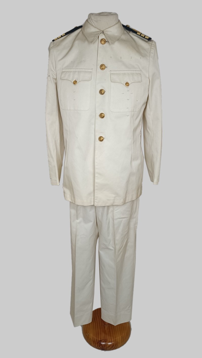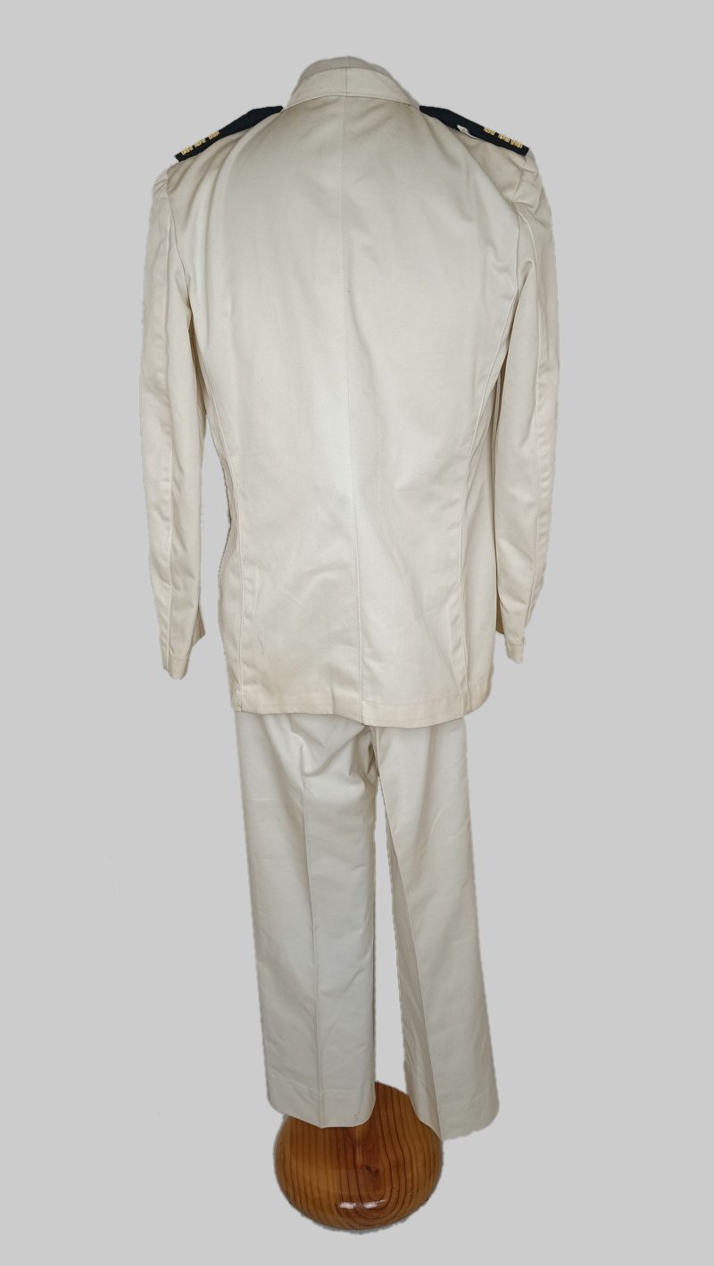 Uniforme de gala de color blanco compuesto por su chaqueta con pantalón correspondiente. Frontal de la chaqueta con botones dorados y palas con divisa de Capitán de Fragata. Pantalón blanco liso.