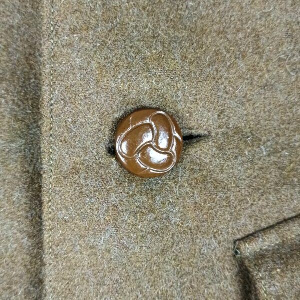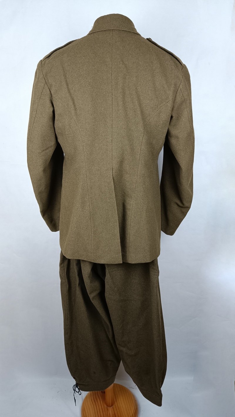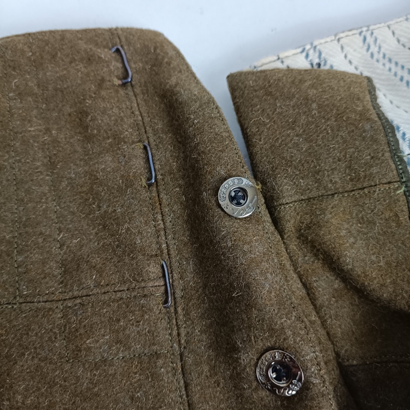 Conjunto compuesto por Guerrera o Chaqueta y su correspondiente pantalón. Uniforme abotonado con botones de pasta y dos bolsillos con costilla a la altura del pecho. Ene l cuello lleva las insingias de 8º Batallon de cAzadores, en latón estampado con el fondo de color verde.