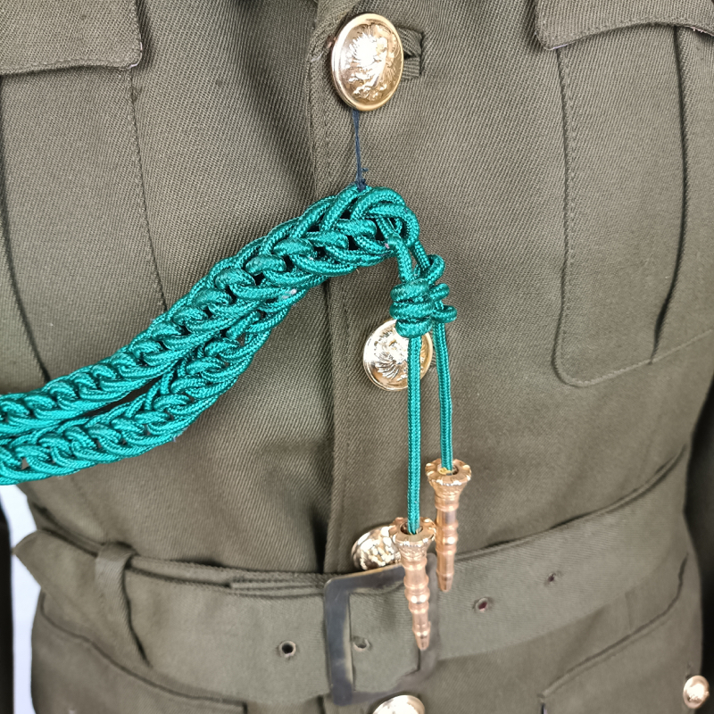 Cordón verde de academia desde la hombrera hasta el botón superior de la chaqueta, con dos borlas doradas metálicas.