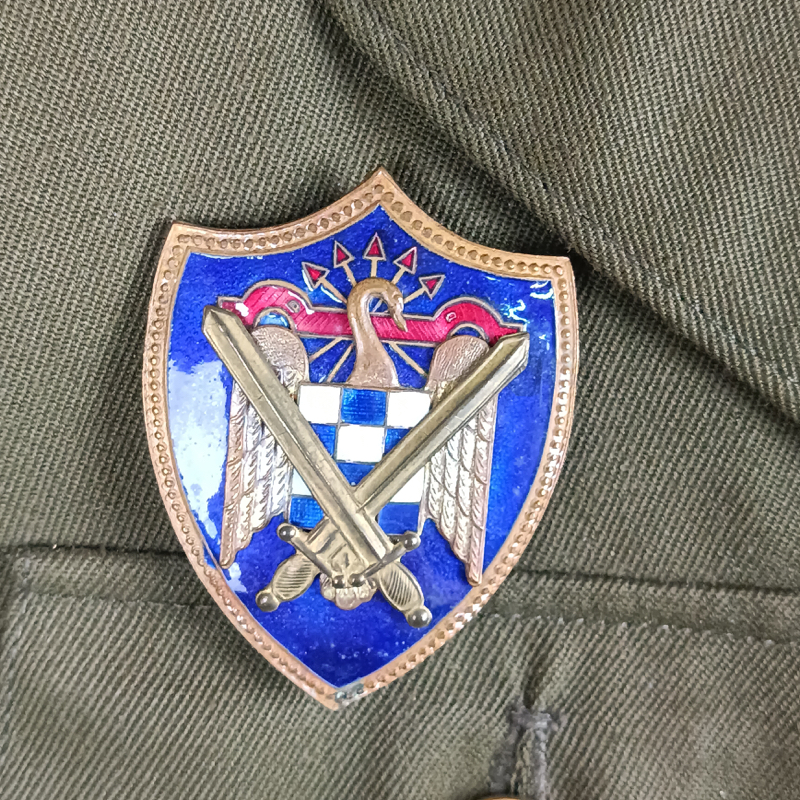 Destaca en el pecho la placa esmaltada de Milicias, distintivo característico utilizado por los oficiales procedentes de las Milicias Universitarias o de complemento. Esta placa representa un escudo esmaltado con cisne y espadas cruzadas.