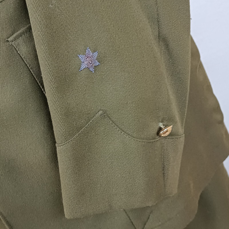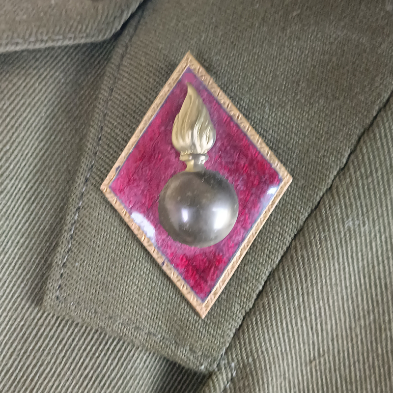 En el cuello se observan rombos esmaltados del arma de Artillería con la característica bombeta sobre fondo rojo, propios de esta especialidad. En la bocamanga se aprecia la estrella bordada correspondiente al empleo de Alférez.
