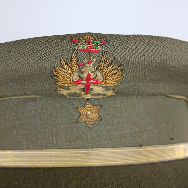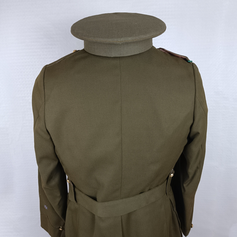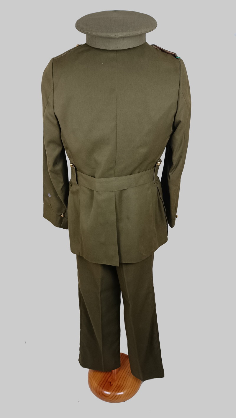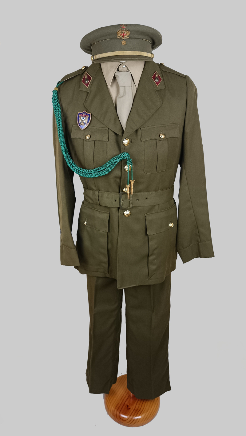 Conjunto completo de uniforme de paseo correspondiente a Alférez del Ejército Español, modelo Reglamento 1943 de cuello abierto, utilizado entre las décadas de 1950 y 1970. La chaqueta presenta cuello abierto con solapas, cuatro bolsillos frontales con botón metálico, ceñidor trasero y botones dorados con emblema del Ejército. Incluye pantalón a juego, gorra de plato y cordón verde de academia sujeto al hombro derecho. Incorpora además la camisa y corbata.