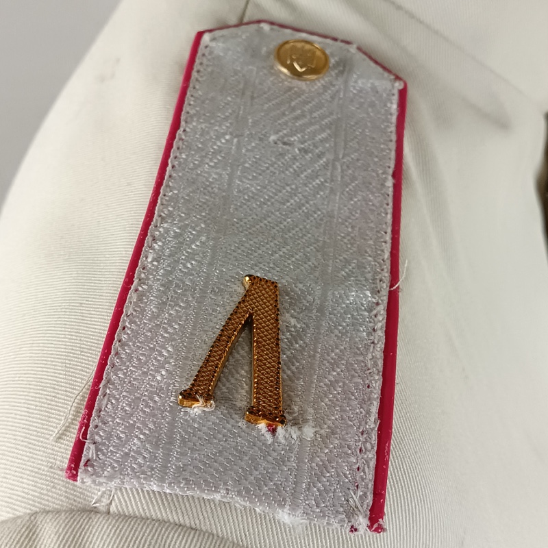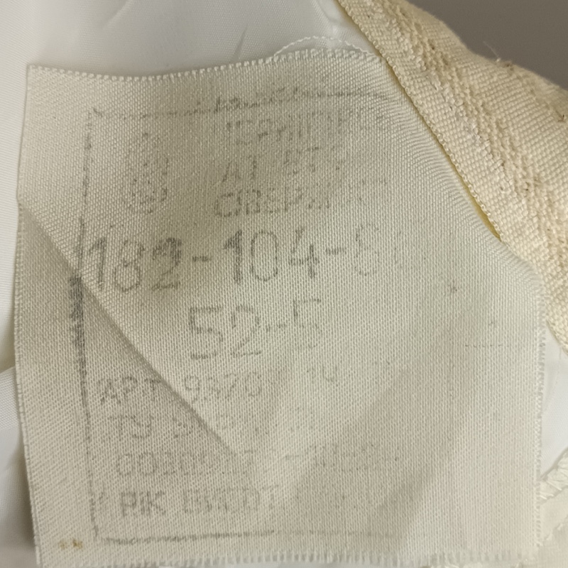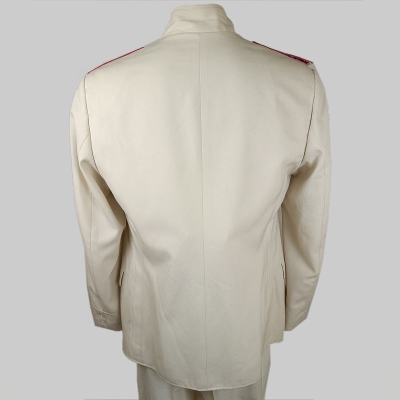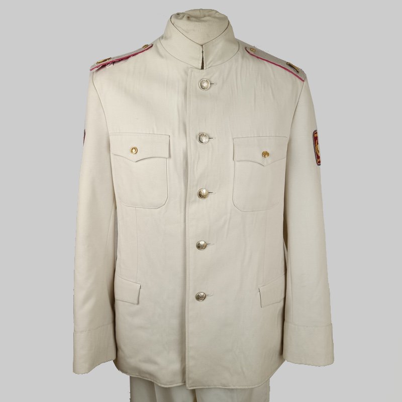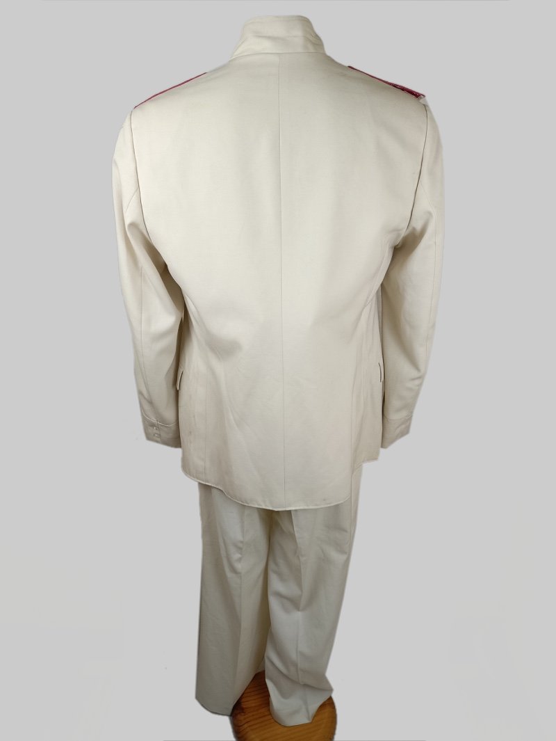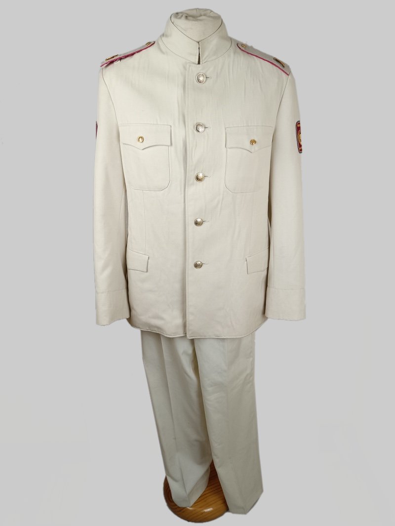 Conjunto compuesto por guerrera y pantalón en color blanco correspondiente a uniforme de paseo de alumno del Liceo Militar de Ucrania. La guerrera presenta cierre frontal mediante botones metálicos con el tridente ucraniano (Tryzub), bolsillos frontales con tapeta y hombreras reglamentarias ribeteadas en color rojo.